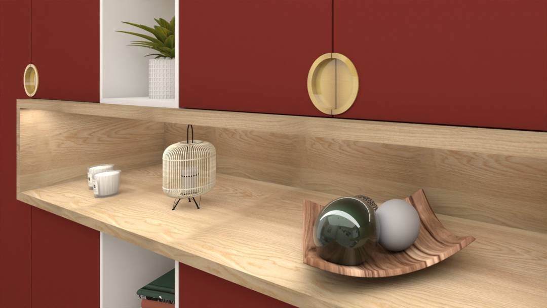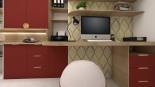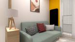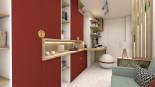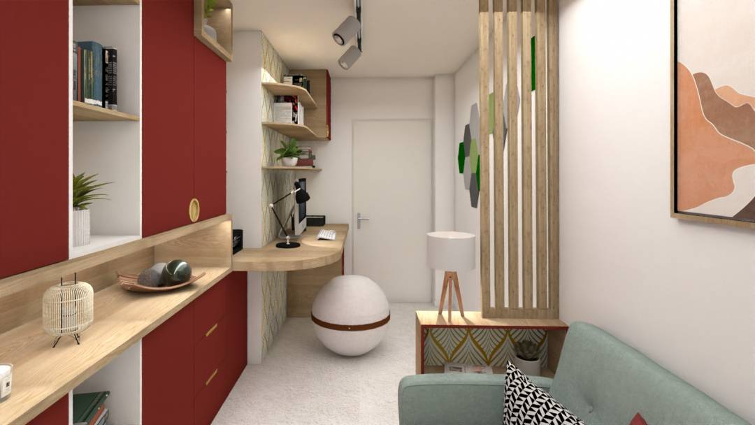 Voici la proposition présentée à un client qui souhaitait réaménager son bureau. Les défis étaient nombreux : - la pièce était petite et étroite - le client souhaitait de nombreux rangements - il fallait que la pièce intègre un couchage d’appoint ainsi qu’un espace détente - le client, hypersensible, avait besoin d’un espace adapté à sa spécificité psychologique J’ai ici misé sur des couleurs chaudes et dynamiques, pour favoriser la concentration. La pièce est fortement isolée phoniquement grâce à la moquette phonique, aux dalles murales (vertes) acoustiques et aux joints des menuiseries qui seront changées. Là encore, plusieurs sources de lumières sont disposées dans la pièce pour que le client, sensible à la lumière, ajuste la luminosité selon ses besoins, notamment avec un rétroéclairage dans le meuble et avec des spots sur rail au plafond. Pour que le client puisse se retrouver dans sa bulle, l’espace détente intègre un clic-clac et est visuellement isolé du bureau grâce à un claustra.