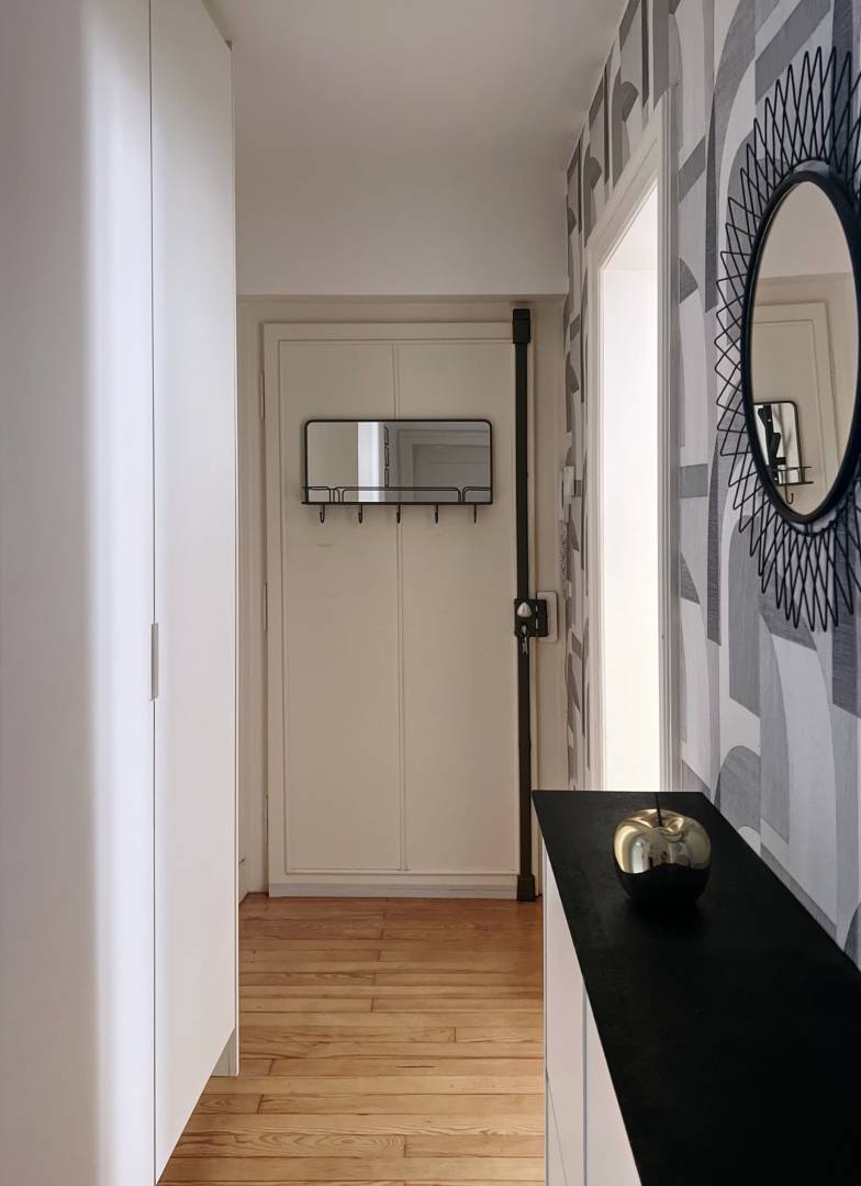 Cet appartement de 71 m², situé dans le quartier de Neudorf à Strasbourg, était resté dans son jus de l’époque. L’objectif de cette rénovation était double: préserver l’authenticité des appartements typiques du quartier tout en le transformant en un espace moderne et fonctionnel.   Un cocon lumineux et chaleureux L’un des axes forts de cette rénovation a été de créer un espace à la fois intime et ouvert sur l’environnement. Un voile a été installé pour préserver l’intimité côté rue tout en laissant entrer la lumière et en valorisant la vue sur les deux cours intérieures de l’immeuble. Optimisation de l’espace et restructuration Initialement composé d’une seule chambre, l’appartement a été repensé pour en intégrer une seconde. L’ancienne cuisine a été transformée en chambre en y posant un nouveau sol, et la cuisine déplacée dans le double espace de vie. Le passage des réseaux a été soigneusement dissimulé entre les solives du parquet, qui a été rénové. Pour agrandir visuellement l’espace, les meubles de la nouvelle cuisine intégrée adoptent des façades blanches, tandis que le bois chêne, en rappel du parquet existant, est placé en retrait. Un claustra sur mesure vient structurer l’espace sans le cloisonner. Il accueille également des étagères intégrées, servant à la fois de séparation et de support fonctionnel : d’un côté, la cuisine avec son îlot accolé, et de l’autre, la salle à manger avec un banc adossé. Cette solution permet de maximiser l’apport de lumière dans la pièce, tout en délimitant les espaces. Une salle de bain repensée pour plus de confort L’aménagement de la salle de bain a été un autre défi. L’objectif était d’optimiser chaque centimètre pour y intégrer une douche plus confortable, des rangements et un espace linge. La douche a été positionnée contre la fenêtre, tandis qu’un meuble vasque sur mesure accueille la machine à laver en partie basse, surmonté d’étagères pour optimiser le rangement. Les éléments techniques ont été dissimulés dans les contre-cloisons et niches de la douche et du WC, apportant une esthétique épurée et fonctionnelle.