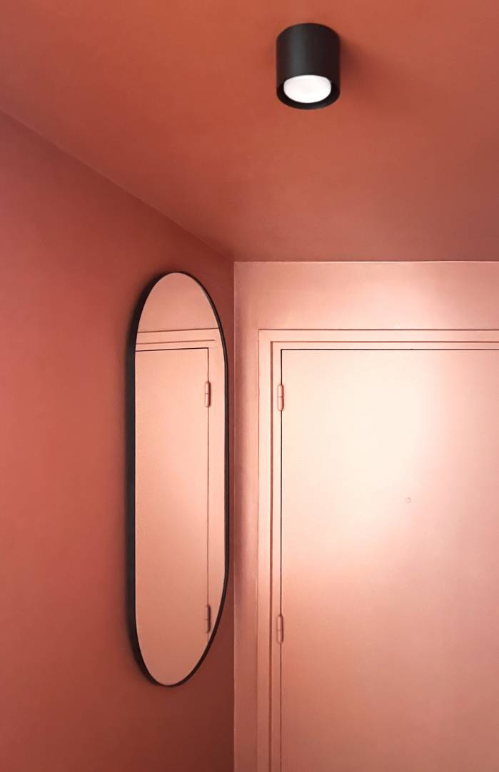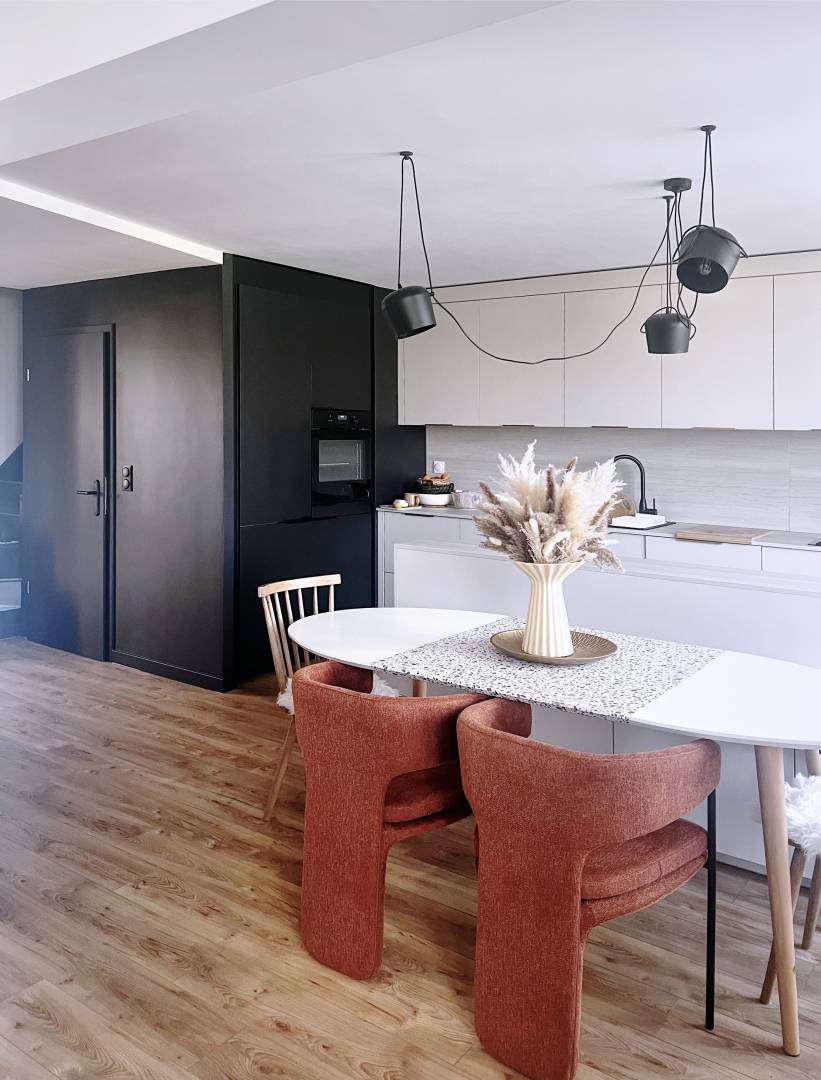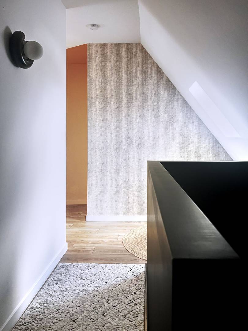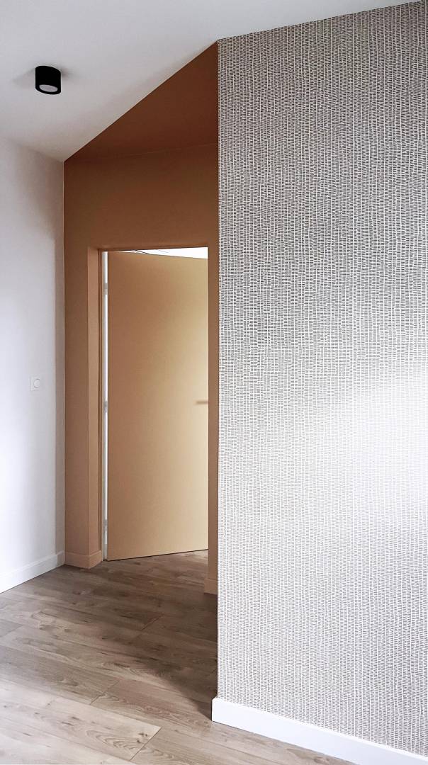 Situé en dernier étage, ce duplex sous combles des années 90 bénéficiait de beaux volumes mais d’un agencement peu cohérent, notamment au regard de sa surface généreuse de 100 m² habitables. Le défi ici était d’optimiser les espaces afin de créer une chambre supplémentaire sans sacrifier la qualité des pièces à vivre.   Restructurer sans alourdir L’intervention a porté sur une restructuration intérieure mesurée mais ambitieuse. La cuisine initialement fermée a été intégrée à la pièce de vie. Pour cela, une ancienne salle de bain a été transformée en buanderie, libérant l’espace pour accueillir une cuisine ouverte et généreuse, dans le prolongement du séjour et de la salle à manger. L’ancien cellier a été reconfiguré pour desservir la nouvelle buanderie, avec un aménagement technique compact sous l’escalier. L’ancienne cuisine devient une chambre (transformable en bureau) et les circulations ont été repensées : l’entrée, désormais ouverte, laisse pénétrer pleinement la lumière dès l’arrivée dans le logement. À l’étage, une salle d’eau agrandie Les modifications principales à l’étage concernent l’agrandissement de la salle de bain, auparavant trop étroite, sur une des chambres existantes. Cette dernière a été restructurée avec des placards sur mesure pour adoucir visuellement les gaines techniques peu esthétiques. Optimisation, clarté et contraste La rénovation repose sur un équilibre entre matériaux accessibles (carrelage, stratifiés) et menuiseries sur mesure pensées par MCLN Architecture, pour structurer et mettre en valeur les volumes. Le color block est utilisé comme outil d’ancrage visuel : terracotta dans l’entrée, noir pour la cuisine-buanderie et autour de l’escalier, ocre en fond de couloir à l’étage. Ces touches chromatiques rythment les espaces, les connectent, tout en clarifiant leur fonction.