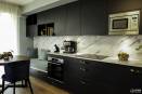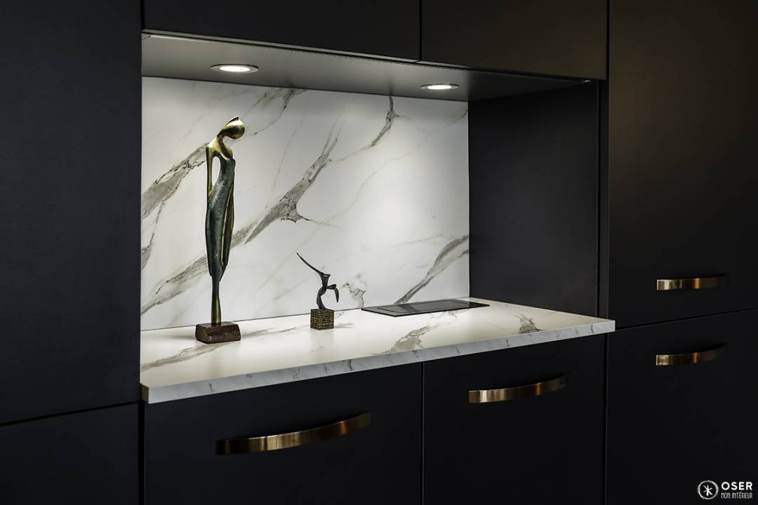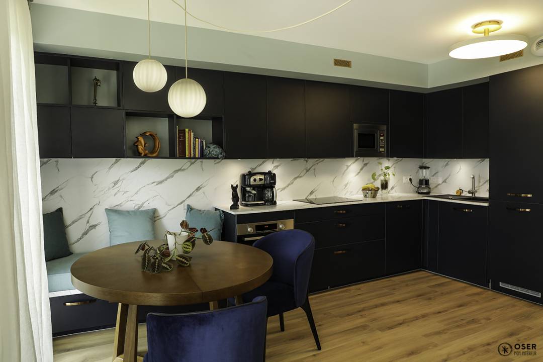 Cette cuisine fait partie d’un projet de rénovation d’un appartement urbain, pensé pour conjuguer élégance contemporaine et fonctionnalité optimisée. L’espace a été restructuré autour d’un linéaire en L et d’un coin repas intégré, dans une palette de teintes contrastées. Les façades noires mates, créent une ligne épurée soulignée par une crédence en effet marbre veiné, qui apporte luminosité et sophistication. Le coin repas a été intégré sur mesure avec une banquette-coffre et une bibliothèque graphique composée de niches, apportant du rangement tout en animant la partie murale. Le choix du bois chaud pour la table et du bleu profond pour les assises crée un équilibre entre matières naturelles et accents modernes. L’ensemble est pensé pour un usage quotidien confortable et esthétique, avec des équipements intégrés, des éclairages ciblés et un soin particulier porté aux finitions.