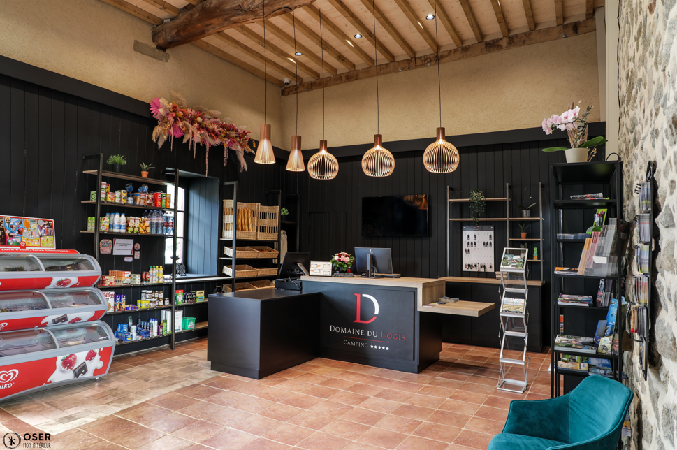 Ce projet a été réalisé pour un camping 5 étoiles souhaitant moderniser l’entrée principale ainsi que l’espace de restauration, tout en conservant l’authenticité du lieu. L’intervention s’est concentrée sur deux zones clés : L’accueil, entièrement réorganisé autour d’un comptoir sur mesure, d’une zone boutique et d’un espace d’information. L’objectif : fluidifier la circulation des visiteurs et offrir un cadre chaleureux et fonctionnel dès l’arrivée. Le restaurant, où l’ambiance a été repensée pour conjuguer esprit terroir et modernité. Les matériaux existants (pierre, bois) ont été conservés et mis en valeur. Un nouveau mobilier a été conçu sur mesure pour s’intégrer à l’architecture existante : tables, assises colorées, banquettes intégrées, éclairages décoratifs. Une attention particulière a été portée à l’agencement du mobilier, à l’optimisation des espaces et au choix des matériaux résistants et esthétiques, adaptés à une fréquentation saisonnière intense.