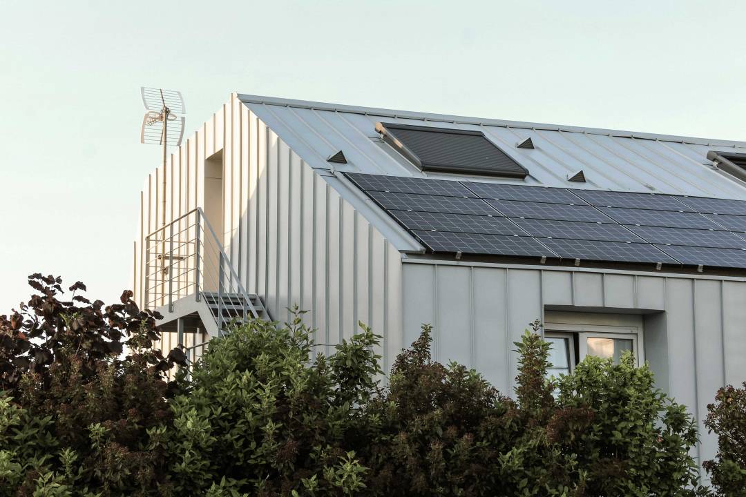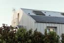 Afin de rendre l’accès à la chambre d’ami indépendant, un escalier extérieur en métal à deux volées est créé dans le prolongement de l’escalier existant en béton. Orientés plein Sud sur la rue, les panneaux photovoltaïques et les grands Velux exploitent au maximum les apports solaires. Côté jardin au Nord, un ensemble de fenêtres fixes et coulissantes en aluminium occupe quant-à-lui toute la largeur de la partie surélevée, offrant au regard la contemplation d’un paysage boisé.