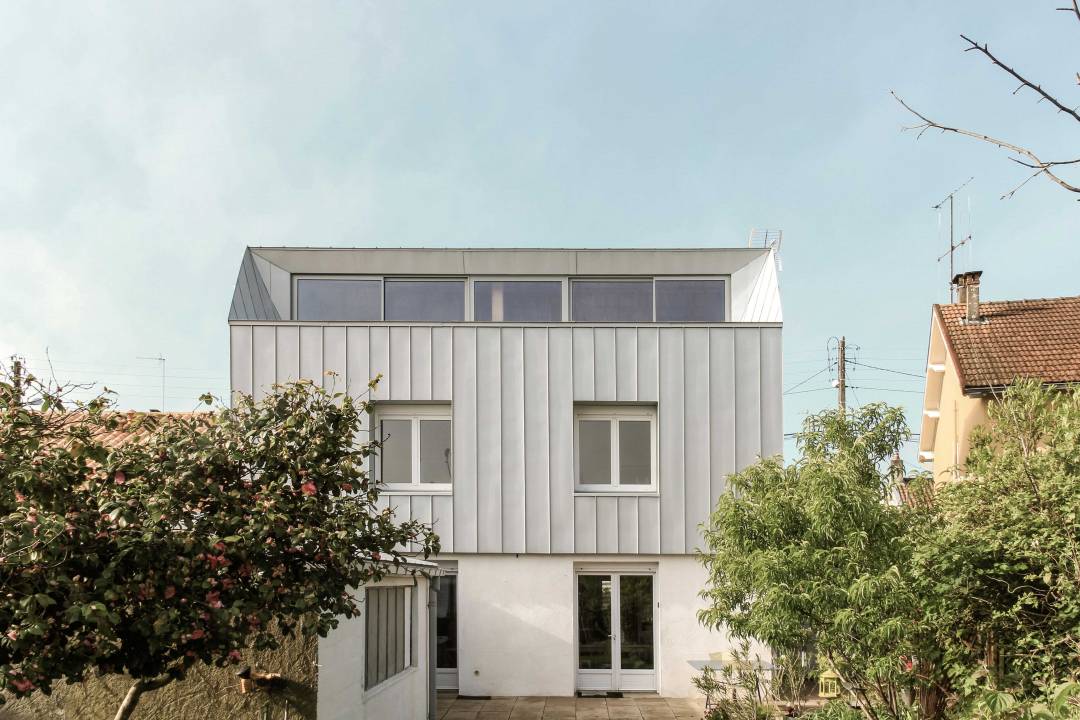 Jouant avec les reflets de lumière, la nouvelle peau de zinc Azengar de cette maison traditionnelle initie un dialogue subtil avec son environnement, et lui donne un second souffle. À l’occasion de travaux de rénovation énergétique et de surélévation, le choix de ce matériau est rapidement apparu comme une évidence. À la fois noble et pérenne, utilisable aussi bien en bardage qu’en toiture, l’exploitation de son potentiel a permis un traitement fin des détails de retournement pour créer une enveloppe continue, comme un écrin. La teinte Azengar, douce et naturelle, en plus de réfléchir le contexte, est sensible aux variations d’ambiances et change légèrement de coloration au gré des conditions météorologiques.
