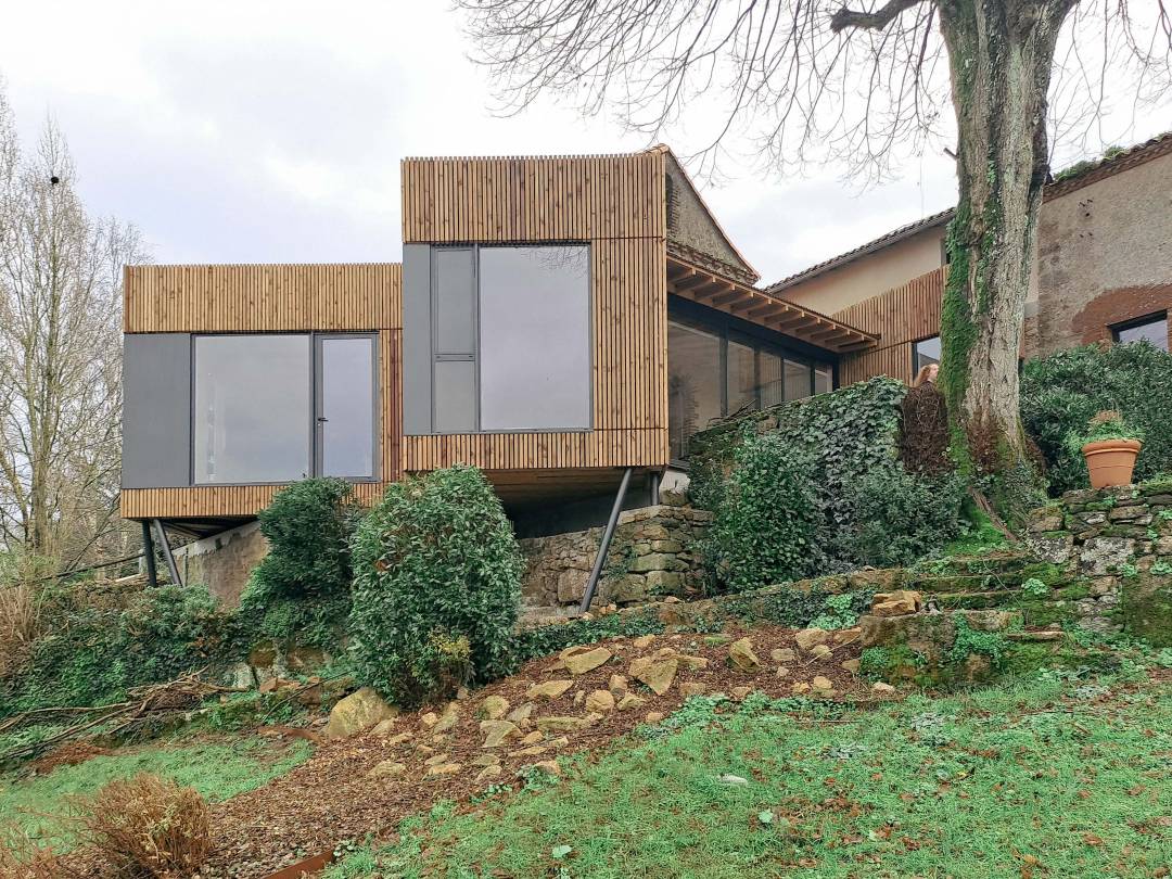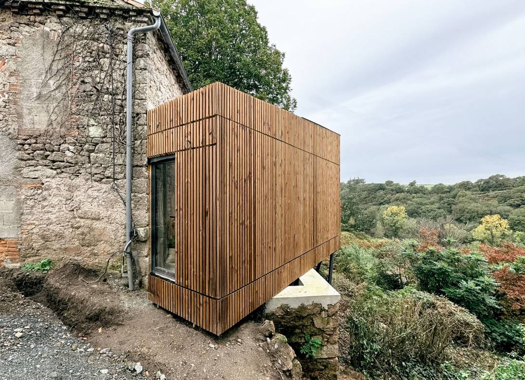 Entièrement réalisée en ossature bois et sur pilotis, l’extension compose avec la déclivité générale du terrain. Telles des cabanes perchées abritant chacune une fonction distincte, les trois volumes principaux fragmentés et suspendus donnent une impression de légèreté en contraste avec les masses des bâtiments anciens. Le bardage bois à claire-voie révèle ces parties existantes en pierre, et se distingue par sa teinte naturelle et chaleureuse. À l’extrémité de chaque entité, les toitures monopentes s’élèvent vers le grand paysage, et les baies vitrées généreuses en aluminium anthracite orientent chaque pièce vers les vues souhaitées, en direction du coteau boisé et de la Sèvre Nantaise en contrebas.