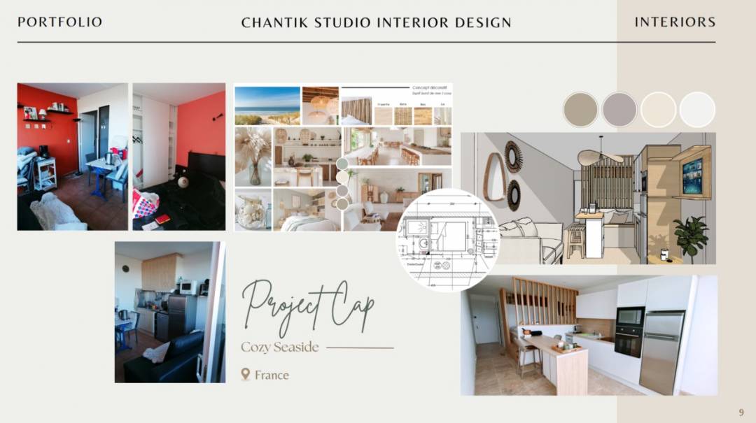 Ce projet concerne la rénovation complète d’un studio de 28 m² (8 m x 3 m), orienté sud-est, comprenant une cuisine/salon, une chambre, une salle de bains et des WC séparés. Le couple propriétaire souhaite un pied-à-terre élégant et fonctionnel pour leurs séjours et des locations saisonnières via Airbnb. Objectifs du projet : Fonctionnalité & optimisation : Aménagement fluide et pratique, maximisation des rangements et circulation, cuisine ouverte avec petite île centrale, salle de bains rénovée, équipements essentiels intégrés pour la location saisonnière. Esthétique & confort : Intérieur minimaliste et lumineux, palette douce (blanc, beige), matériaux naturels (bois clair, travertin, textiles lin et coton), ambiance cosy et élégante rappelant la douceur de la mer. Durabilité : Matériaux résistants aux conditions côtières, finitions haut de gamme, espace durable et facile à entretenir malgré les rotations fréquentes de locataires. Concept décoratif : Cozy Seaside Un intérieur lumineux et accueillant, combinant simplicité, confort et charme côtier, où chaque détail contribue à une atmosphère apaisante et raffinée.
