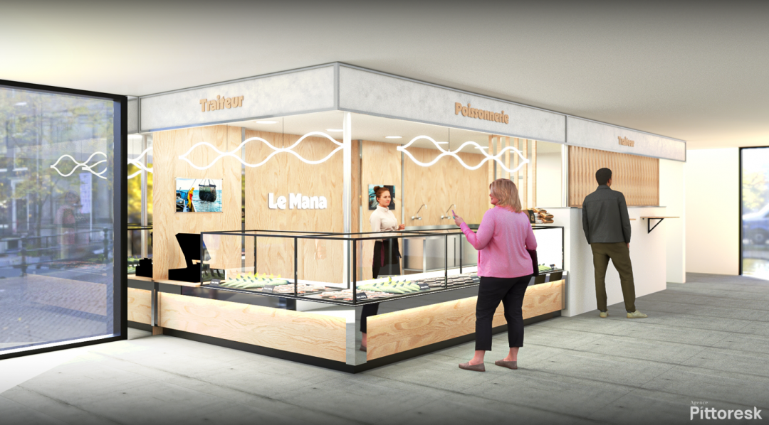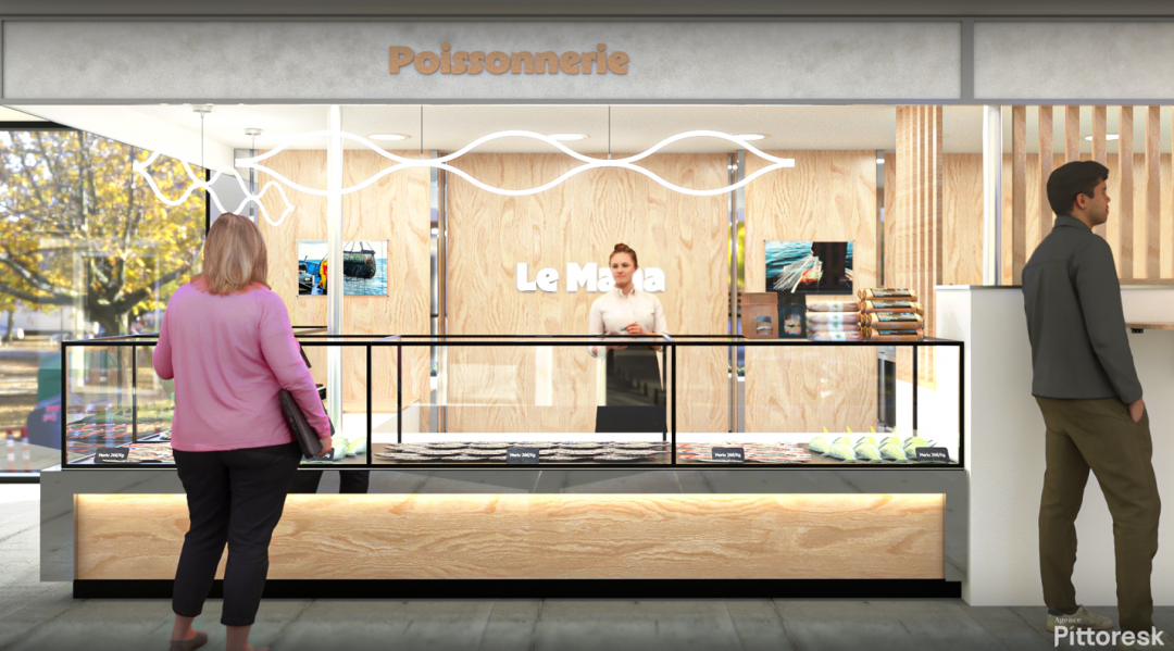 Dans le cadre de notre projet de modernisation de la poissonnerie, nous avons voulu créer un espace à la fois moderne et naturel, qui attire également visuellement les clients et se démarque. En utilisant un aspect bois ramenant à l’origine naturelle et enrobé par des touches chromées et lumineuses pour inspirer la modernité. Un logo typographique a été repensé pour s'harmoniser avec cette identité plus moderne. Sa nouvelle version, plus dynamique, incorpore une typographique inspirée de la mer. Cette transformation visuelle a été soigneusement conçue pour être facilement reconnaissable et mémorable pour nos clients. Une signalétique simple en partie supérieur, un fond à l'aspect pierre dans le but de garder un esprit neutre encadré d'un cadre chromé pour mettre en valeur les lettres découpées en bois faisant écho à l'habillage global de l'espace. En somme, ce projet ne se limite pas à l'esthétique ; il crée une atmosphère qui invite les clients à explorer, choisir et apprécier. Grâce à une direction artistique complète et des artisans partenaires talentueux, chaque aspect de cette poissonnerie modernisée est une invitation à redécouvrir les plaisirs de la mer.