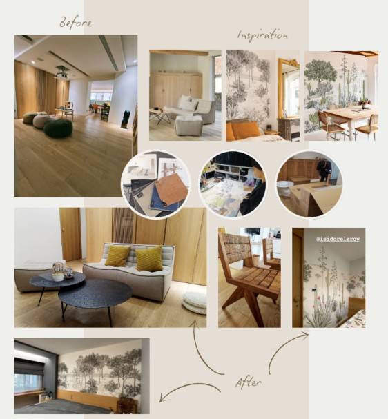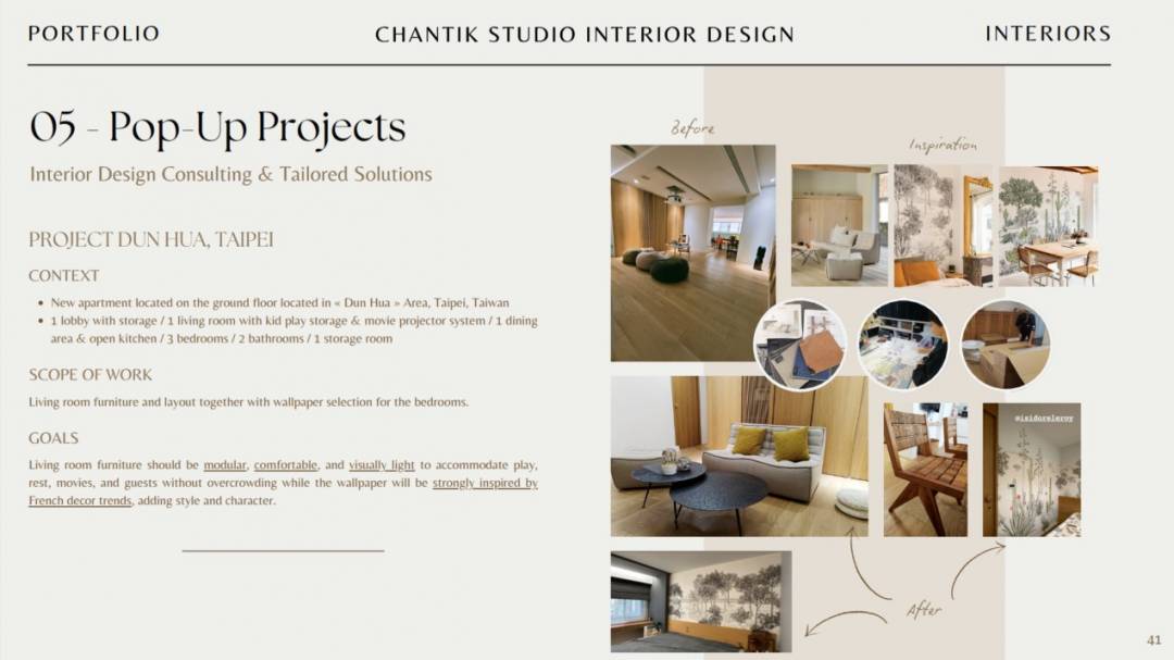 Contexte: Nouvel appartement de 150 m² situé au rez-de-chaussée dans le quartier « Dun Hua », Taipei, Taïwan, comprenant un hall d’entrée avec rangement, un séjour avec espace de jeu pour enfants et système de projection, une salle à manger avec cuisine ouverte, 3 chambres, 2 salles de bains et un local de rangement. Mission : Conseils sur le choix du mobilier et l’aménagement du séjour, ainsi que sur la sélection de papiers peints pour les chambres, avec un accent particulier sur la French touch souhaitée par la cliente. Objectifs : Créer un intérieur fonctionnel, modulable et lumineux, où le mobilier confortable et léger permet de jouer, se détendre et recevoir tandis que les papiers peints inspirés des tendances françaises apportent élégance et personnalité.