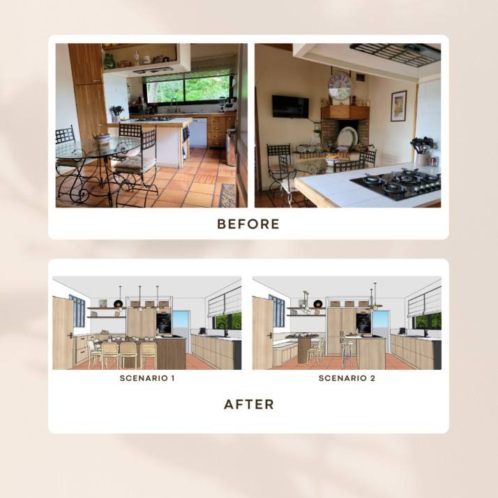 Contexte : Notre cliente souhaitait rénover sa cuisine actuelle agéé de plus de 20 ans en une cuisine fonctionnelle, adaptée à la vie quotidienne et à la convivialité. L’îlot central, élément clé de cette rénovation, a été pensé pour allier praticité et design. Avant : Une cuisine fermée, peu lumineuse, qui ne répondait plus aux besoins actuels. Après : Une transformation complète avec des lignes épurées, des matériaux durables et l’ajout d’une cloison vitrée entre la cuisine et la salle à manger, offrant ainsi plus de lumière naturelle et une sensation d’espace, tout en conservant une structure organisée. Deux configurations ont été étudiées pour l’îlot central : Option 1 : Prolonger l’îlot avec une table de hauteur classique, combinant praticité et élégance dans un même ensemble. Option 2 : Prévoir un îlot plus compact, idéal pour les repas rapides et les apéritifs, associé à un espace repas séparé pour plus de confort. La conception du projet a été entièrement conçu à distance.