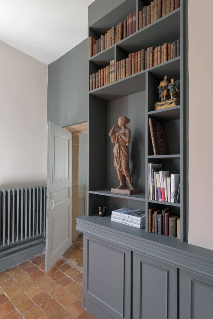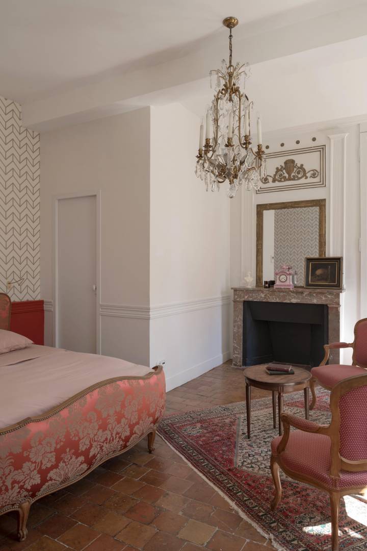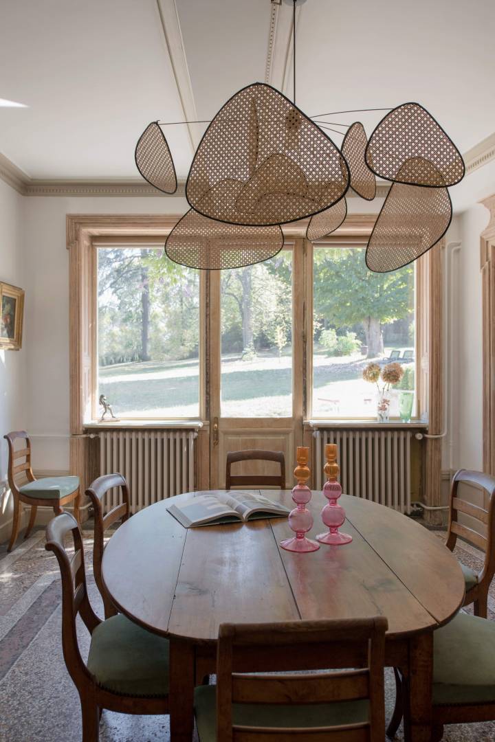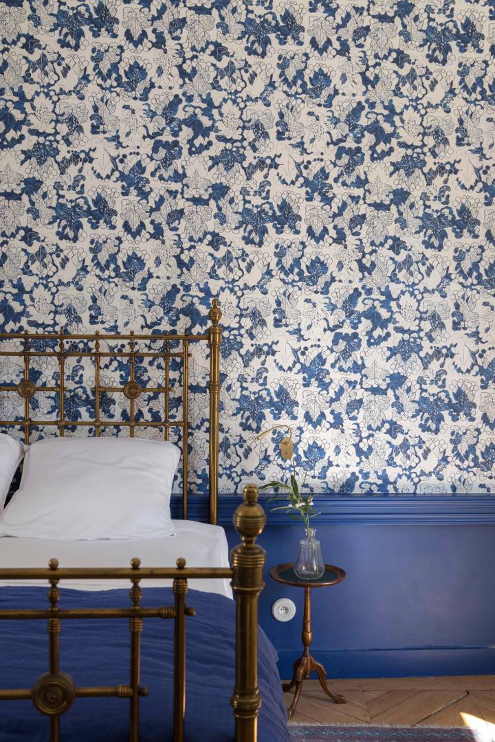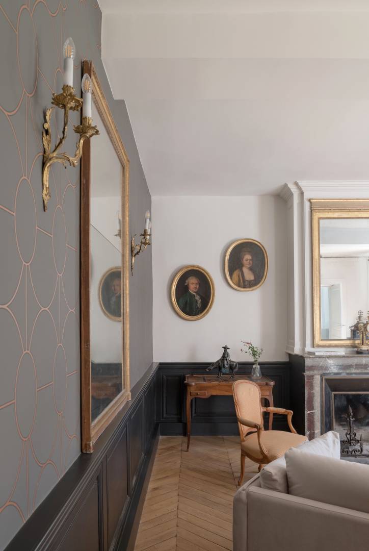 Des couleurs « actuelles » aux murs et jusqu’aux plafonds ou encore des boiseries anciennes jusqu’aux tableaux de chasse. Les papiers peints s’intègrent parfaitement entre les boiseries et dessinent les volumes. Les luminaires révèlent le tout et composent les ambiances.