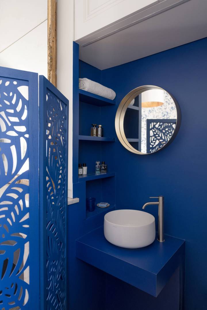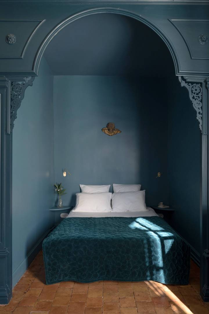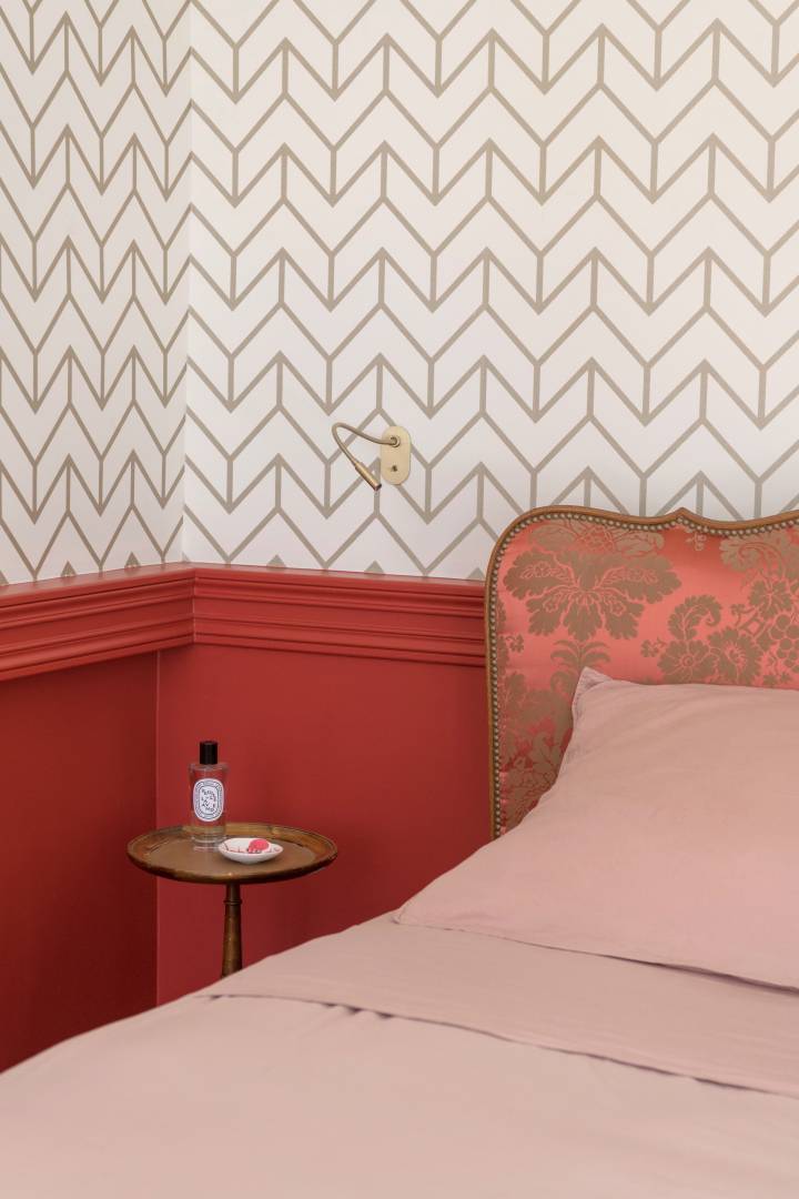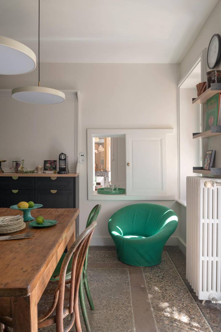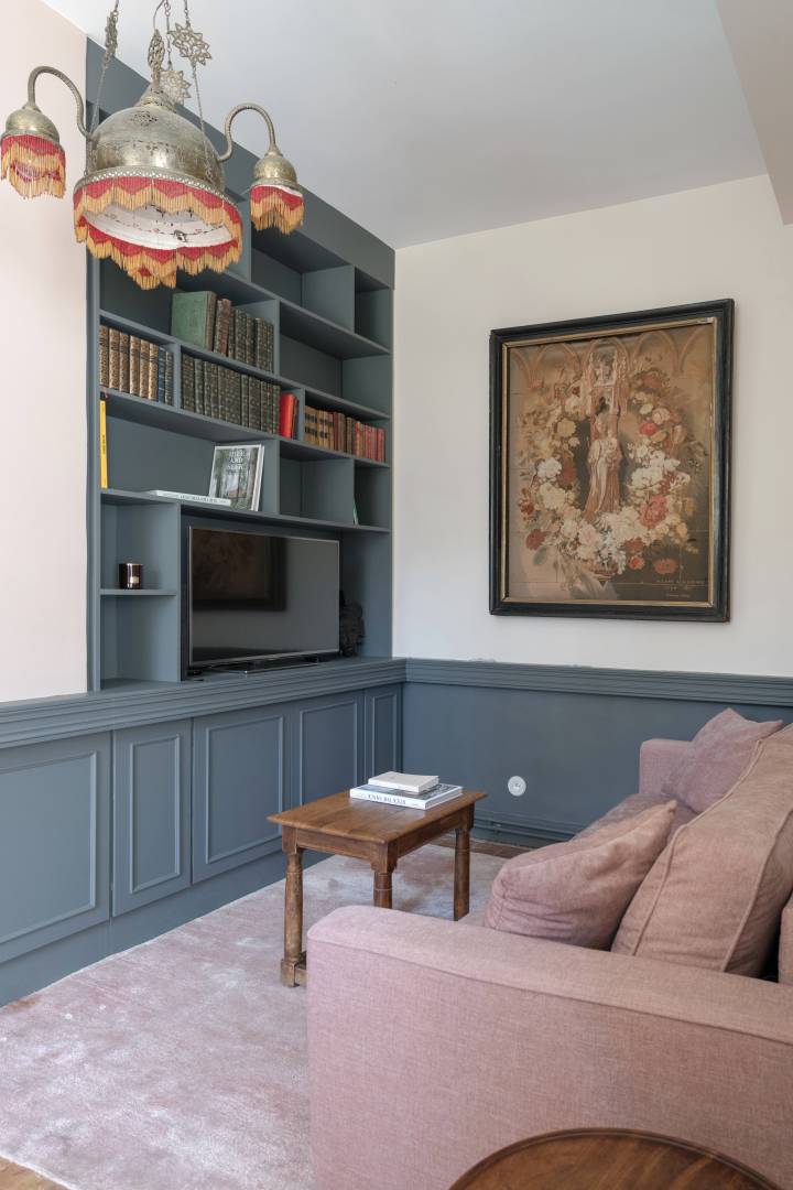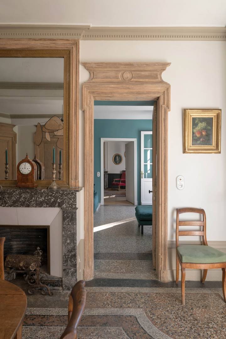 Des couleurs « actuelles » aux murs et jusqu’aux plafonds ou encore des boiseries anciennes jusqu’aux tableaux de chasse. Les papiers peints s’intègrent parfaitement entre les boiseries et dessinent les volumes. Les luminaires révèlent le tout et composent les ambiances.
