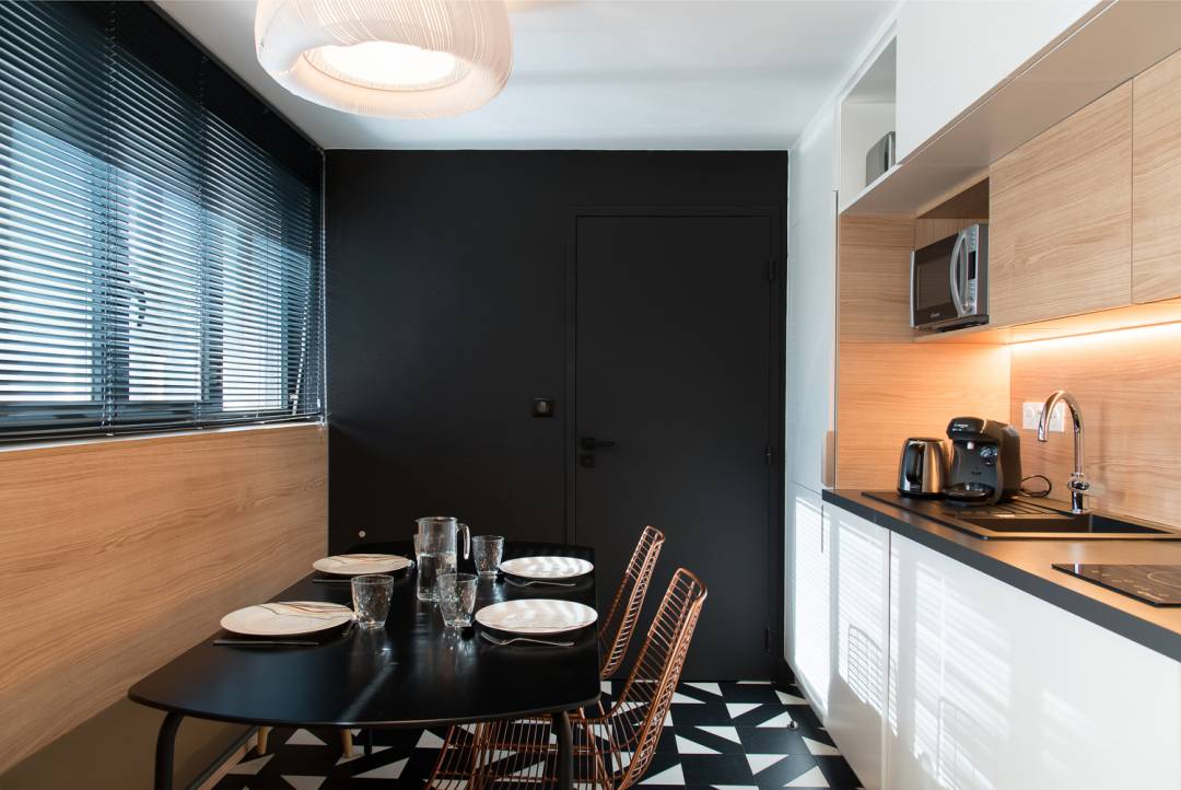 Convertir des bureaux en logements représente un véritable enjeu pour une ville durable et résiliente. Transformation de bureaux en Appart-Hôtel de courte durée : 1 T2 et 2 studios. Reconversion de bureaux en rez-de-chaussée sur rue. Recherche d’optimisation des surfaces Choix de mobiliers et luminaires pour créer des ambiances différentes