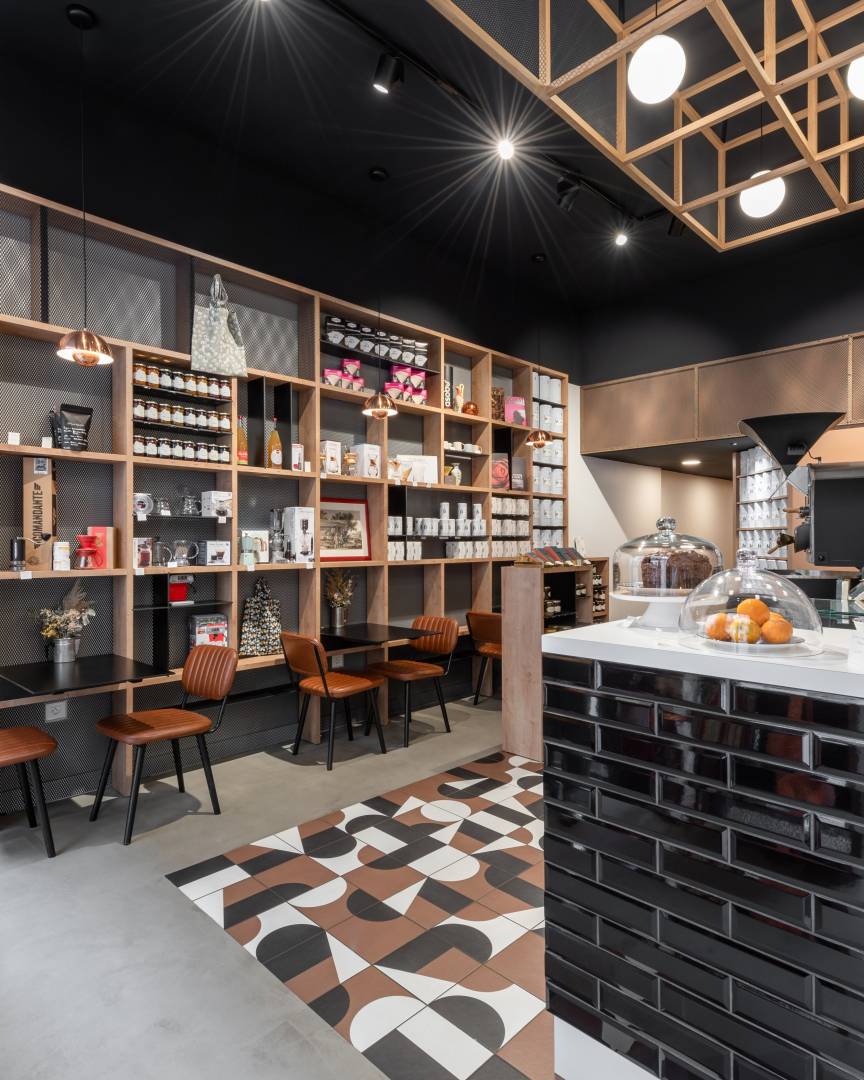 Permettre à la fois d’offrir des espaces de présentation des produits ainsi que des espaces de dégustation. Le travail des matières et couleurs a permis de créer une véritable identité pour ce lieu. Le marron et le noir pour le café dans ses différents états (brut et torréfié), le blanc pour le « latte », la maille pour rappeler le textile des sacs de conditionnement du café, le tout pour offrir un lieu cosy et convivial.