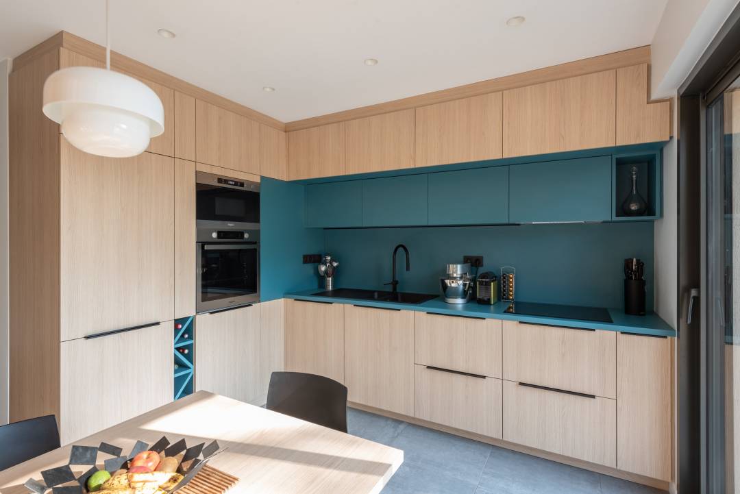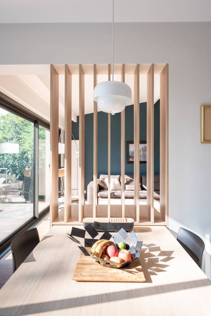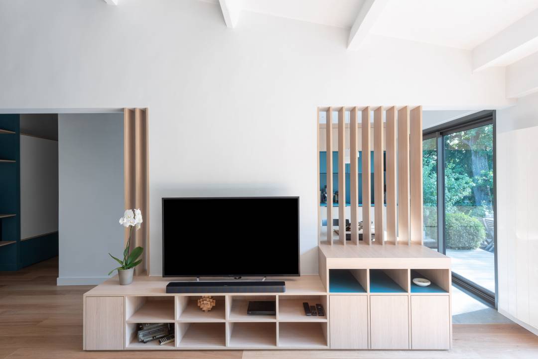 Il a donc s’agit de décloisonner le séjour, noyau de la maison, de créer des mobiliers sur mesure. Ces mobiliers sur mesure forment le lien entre les espaces et répondant à de nouveaux usages (bibliothèques, meubles TV, table de cuisine évolutive…) Autant de réponses et d’adaptations qui offrent aux occupants des espaces plus adaptés à leur façon d’habiter sans dénaturer les volumes et le caractère du bâti existant.