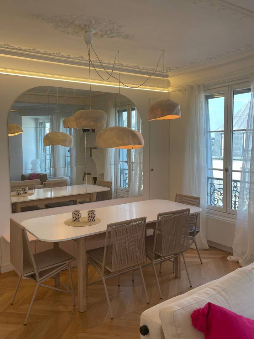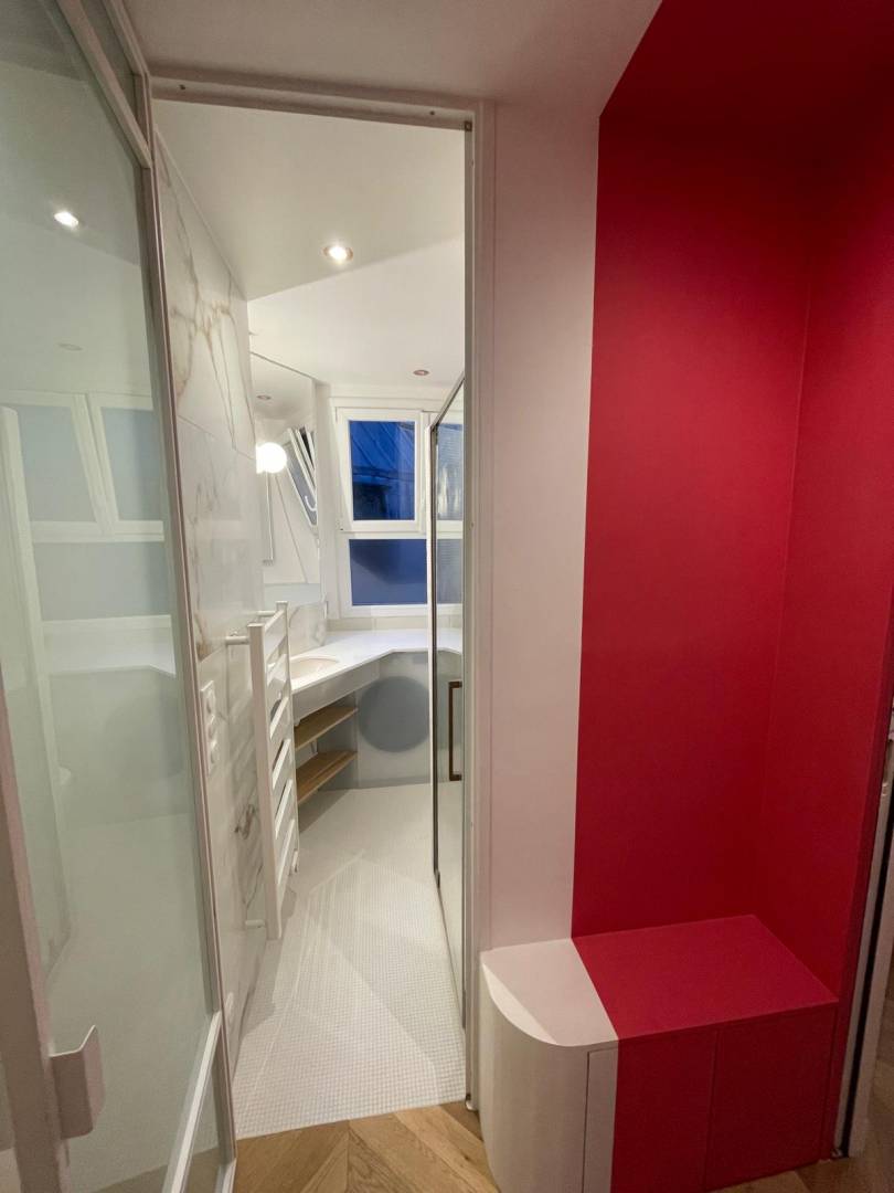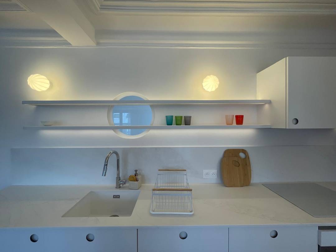 Rénovation d'un pieds à terre parisien Haussmannien, pour le compte d'un couple américain : - dépose de cloisons, - déplacement de la cuisine, - changements des huisseries, - nouveau parquet - rénovation des corniches - meubles sur mesure - pose d'une climatisation