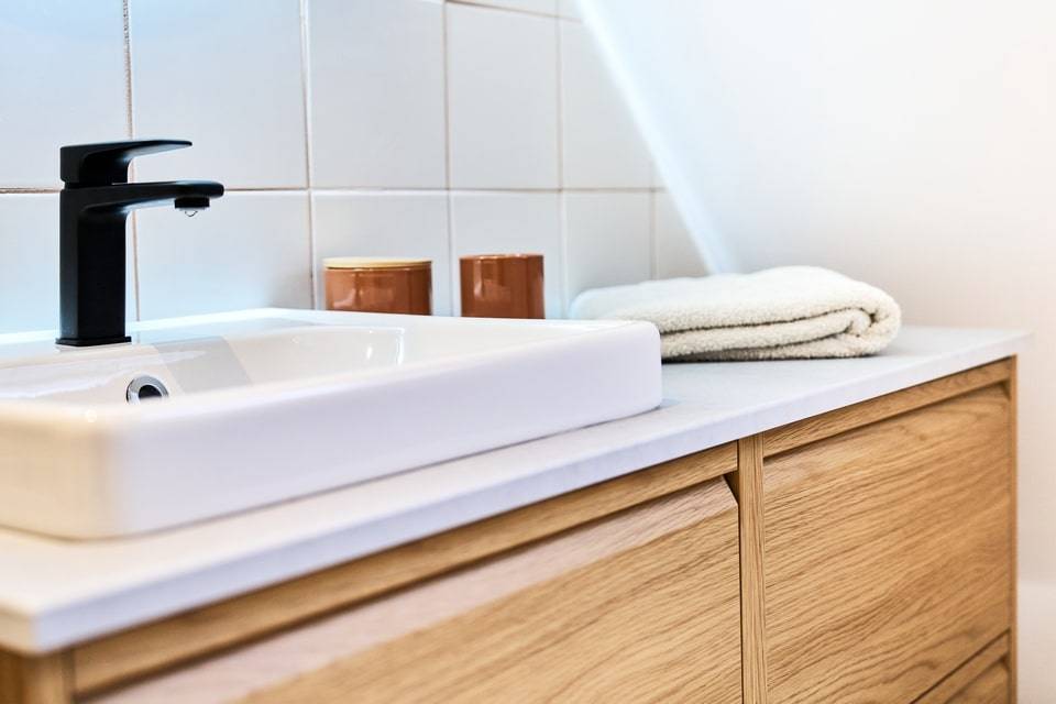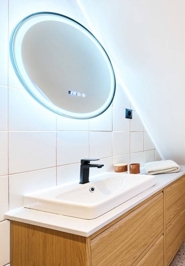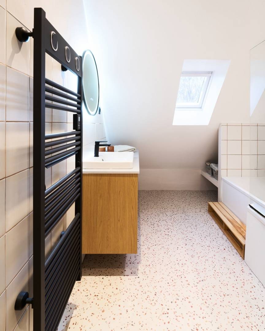Transformation de cette petite salle de douche située sous pente en une vraie salle de bains pour une famille avec deux enfants. Il s’agissait d’une salle de bains dans son jus, datant de la construction de la maison, soit 1977. pour laquelle j'ai dû composer avec une surface réduite de 7,45m² (3,75m² loi Carrez). Une nouvelle logique d’espace La maison, dotée à l’origine d’une salle de bains au rez-de-chaussée et d’une salle de douche à l’étage, nécessitait de réorganiser ses espaces pour mieux répondre aux besoins du quotidien. Avec les chambres situées à l’étage, l’idée d’installer une baignoire sur ce niveau s’est imposée comme une évidence, surtout pour faciliter la vie de la famille, notamment avec l’arrivée imminente d’un nouveau-né. Un agencement optimisé Une baignoire douche a été installée, avec un espace de 90 x 90 cm au niveau le plus large, pour combiner confort et praticité. La pièce accueille également un meuble vasque de 120 cm en chêne, offrant des tiroirs individuels pour chaque membre de la famille, et un miroir lumineux antibuée avec trois teintes de lumière. Une niche pratique a été aménagée près de la baignoire, parfaite pour ranger serviettes, jouets de bain et marchepieds pour aider les enfants à gagner en autonomie. Le radiateur sèche serviettes chauffe agréablement l’espace. On remarque les astucieux crochets au service du désencombrement visuel. Une ambiance élégante J'ai opté pour un sol PVC effet Terrazzo, antidérapant et adapté aux pièces humides. Des carreaux blancs mats de 20 x 20 cm habillent les murs autour de la baignoire jusqu’à pleine hauteur et jusqu’à 160 cm près de la vasque, tandis que les joints terracotta rappellent les nuances chaudes du sol. La peinture « mousse de café », un beige légèrement rosé, a été appliquée sur les murs, tandis que la soupente et le plafond sont restés blancs pour maximiser la luminosité. Des spots orientables remplacent le plafonnier d’origine, apportant une lumière modulable. Pour apporter une touche de modernité et de sophistication, la robinetterie et les accessoires ont été choisis en noir mat. Cette finition contraste élégamment avec les tons clairs des murs et du carrelage, tout en renforçant le caractère contemporain de la pièce. Crédit photo : Rodolphe Debyser