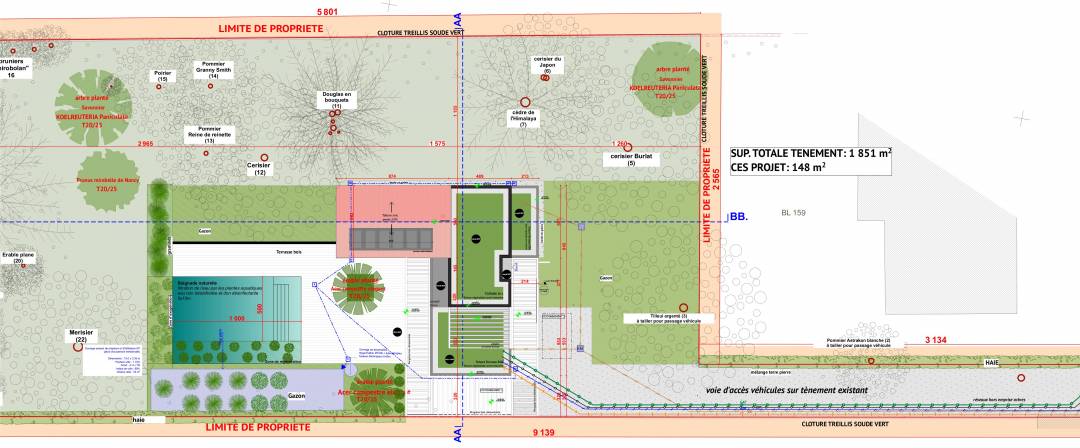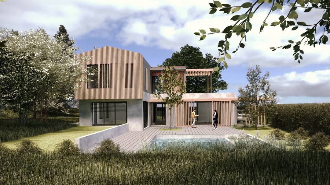 Construction d’une maison individuelle en vue de vendre un terrain. Spécificités du projet : Terrain en secteur végétalisé à préserver / implantation du projet en tenant compte du positionnement des arbres quasiment tous préservés Construction en mixte béton et bois RT 2012 Toiture végétalisée semi-intensive Couverture en zinc / Habillage de façade en zinc Panneaux photovoltaïques en toiture Pergolas pour protections solaires Piscine naturelle avec filtration par les plantes