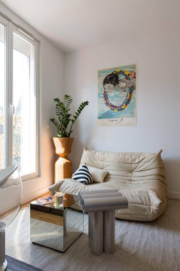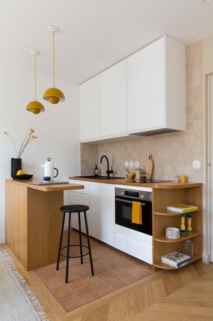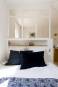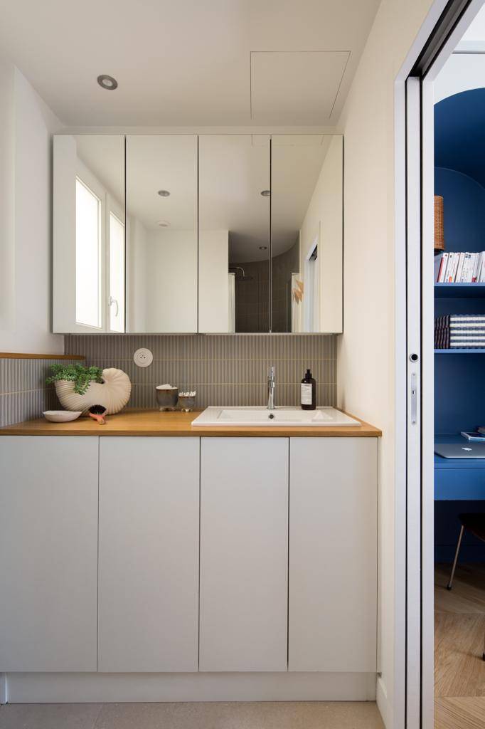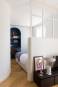 Ce studio niché sous les toits a été entièrement rénové. L’isolation a été renforcée et une climatisation gainable réversible installée pour garantir le confort en toute saison et une faible consommation énergétique. L’agencement a été pensé pour optimiser chaque mètre carré tout en préservant une circulation fluide, notamment grâce à une salle de bain aux lignes courbes et à de nombreux éléments intégrés. Enfin, nous avons conservé les codes de l’appartement parisien avec des matériaux traditionnels comme les tomettes et un parquet en point de Hongrie, qui apportent au lieu une élégance intemporelle.