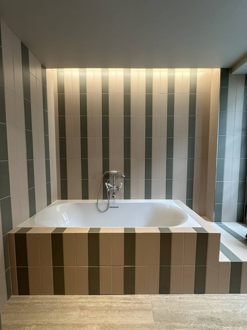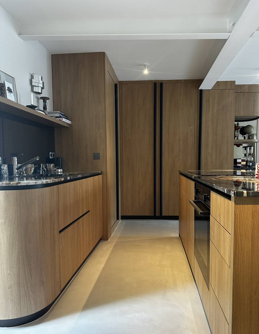 Cet appartement de 110m² est situé dans un immeuble qui aurait été autrefois un relais de poste. Sa structure en bois, très ancienne et fragilisée par le temps, nécessitait une intervention structurelle avant même d’aborder la rénovation intérieure. Le projet a également consisté à réunir deux appartements en un seul, grâce à la création d’une trémie permettant l’installation d’un escalier et une redistribution complète des volumes. L’appartement a été repensé dans son intégralité pour accueillir une famille de cinq personnes : quatre chambres, deux salles de bain et trois WC ont été intégrés dans cette surface optimisée. De nombreuses solutions sur mesure ont été mises en place pour maximiser les rangements, tout en associant matériaux précieux et mobilier de grande distribution afin de préserver l’équilibre entre raffinement et budget maîtrisé. La cuisine, véritable cœur de la pièce à vivre, s’articule autour d’un îlot central en quartzite, qui structure l’espace et invite à la convivialité. Dans l’ensemble du projet, l’accent a été mis sur l’utilisation de matériaux intemporels et durables. Un sol en micro-ciment, appliqué sur une grande partie de l’appartement, crée une unité visuelle qui atténue la faible hauteur sous plafond et met en valeur les volumes, les menuiseries et les jeux de couleur.