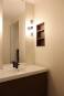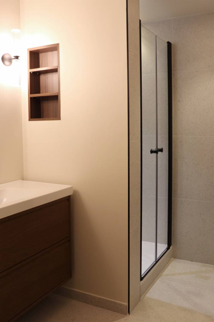 Rénovation d'une salle de bain en salle d'eau dans un appartement des années 90. La demande client : Un espace soyeux, doux et envelopant, en optimisant chaque cm². Le blanc chaud et le terrazzo remplacent l'ancien carrelage rose. Le plan est pensé pour rendre cet salle d'eau fonctionel, en donnant un espace défini pour chaque moment d'hygiène et de bien-être. La séparation douche/lavabo permet l'installation de deux niches. L'une en bois côté vasque, l'autre en terrazzo côté douche.