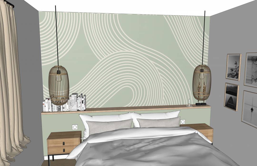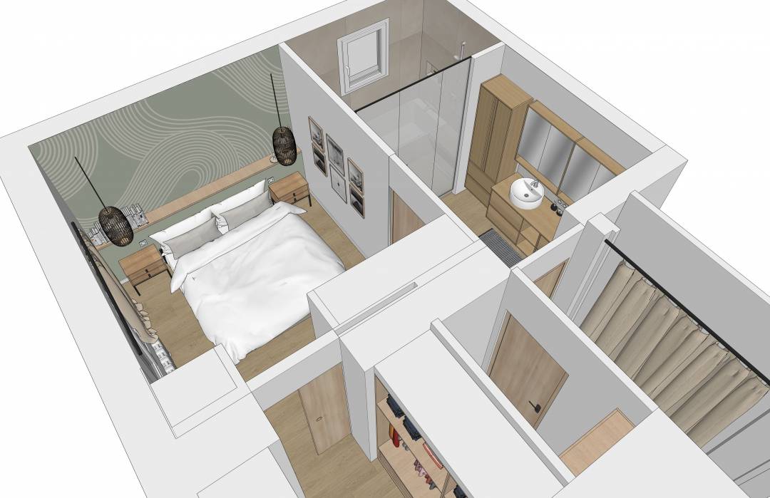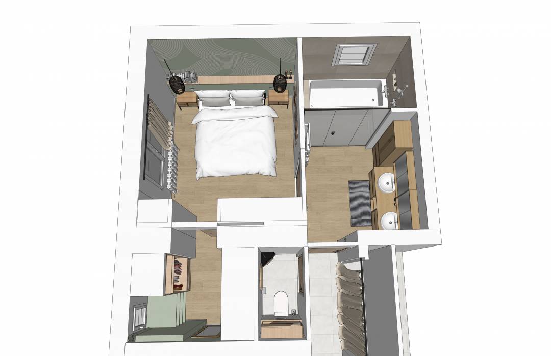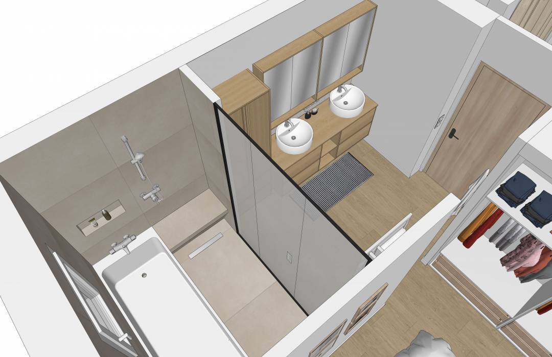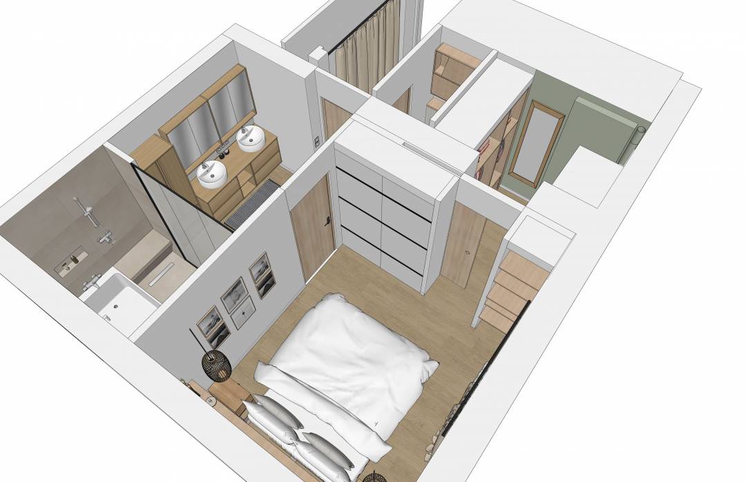 Les clients souhaitaient transformer la chambre de leurs enfants en futur espace parental, incluant la salle de bains jouxtant la pièce. Le point de départ a été de créer une salle de bains "japonisante", où baignoire et douche ne font presque qu'un et de repenser les volumes pour intégrer un dressing dans ce qui est actuellement leur WC. Les clients ont été accompagnés sur la réalisation de plans, et modélisations 3D leur permettant de se projeter, et ont reçu un dossier complet à transmettre aux artisans.