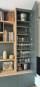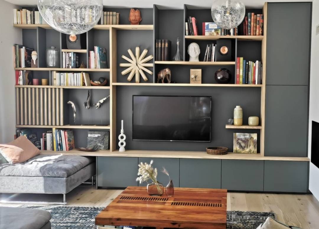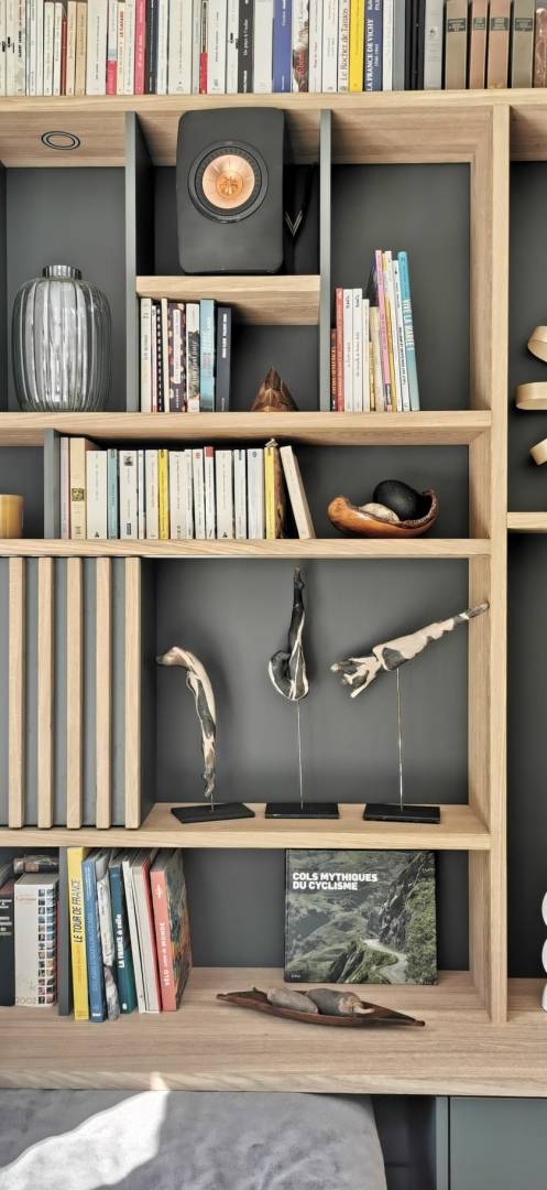 Un mur de rangement à imaginer pour ces clients fraîchement propriétaires de leur maison neuve. Nous avons tout étudié et surtout, nous avons écouté nos clients dans leurs envies et leurs besoins pour concevoir cette bibliothèque mélânt structure en chêne naturel et porte de couleur. Un jeu de niches et d'étagères pour y présenter les sculptures de ma clientes, de la déco et quelques livres, des portes et tiroirs aux fermetures push up pour un usage facilité, un espace pour les CD et un grand rangement pour de la vaisselle. J'ai conçu ce meuble adapté à la pièce, sur-mesure, et travaillé ensuite avec un ébéniste local.