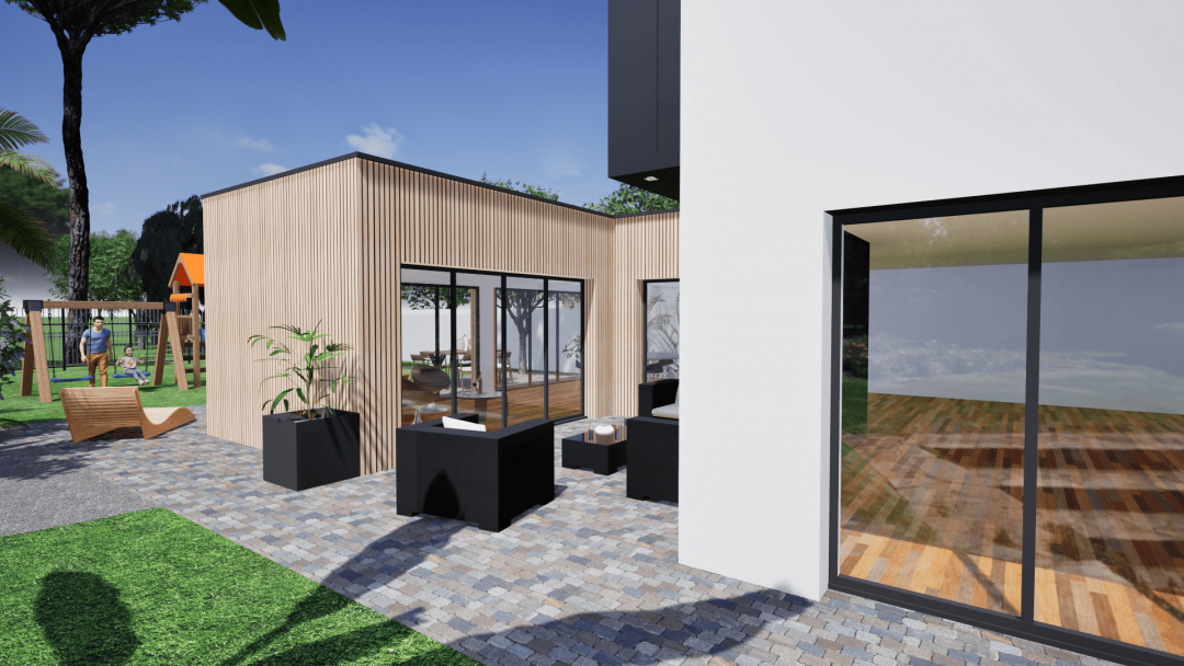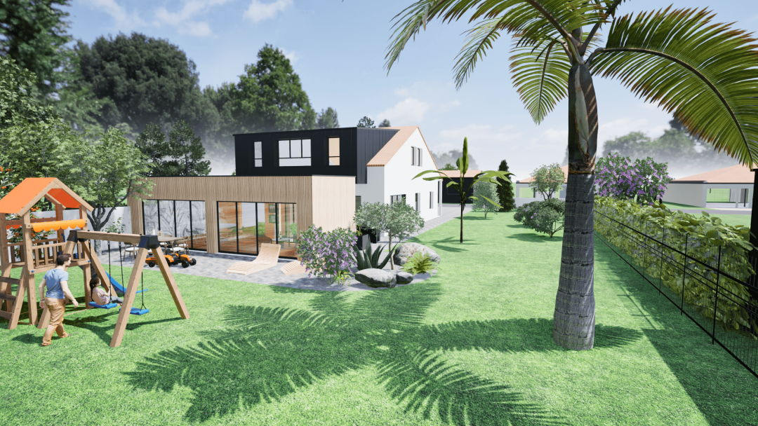 Réalisation d'une extension et d'une lucarne en ossature bois. Missions confiées : Dossier du permis de construire Visuels 3D