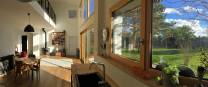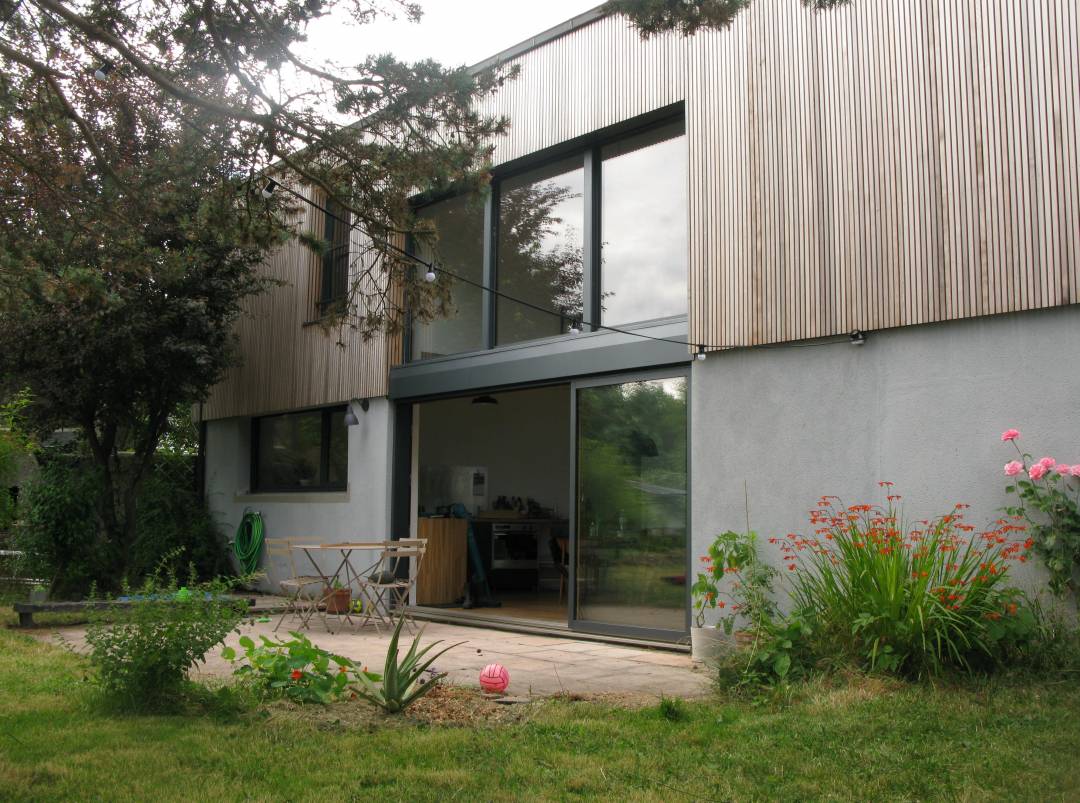 En concertation avec les clients, nous avons proposé une surélévation partielle des volumes bas, sans toucher au faîtage. Ce qui a permis l'ajout de deux chambre et d'un beau volume sur séjour. Le résultat est une maison qui a retrouvé une unité, mais surtout beacoup de lumière et de vue sur le ciel. La cuisine a été déplacée côté jardin, Un bureau en mezzanine sur le séjour offre un espace de travail serein et chaleureux.
