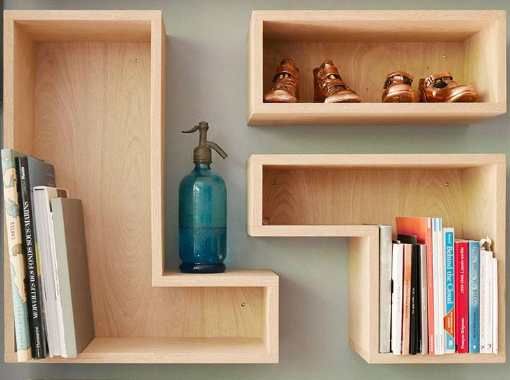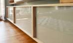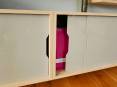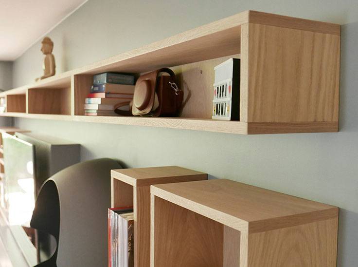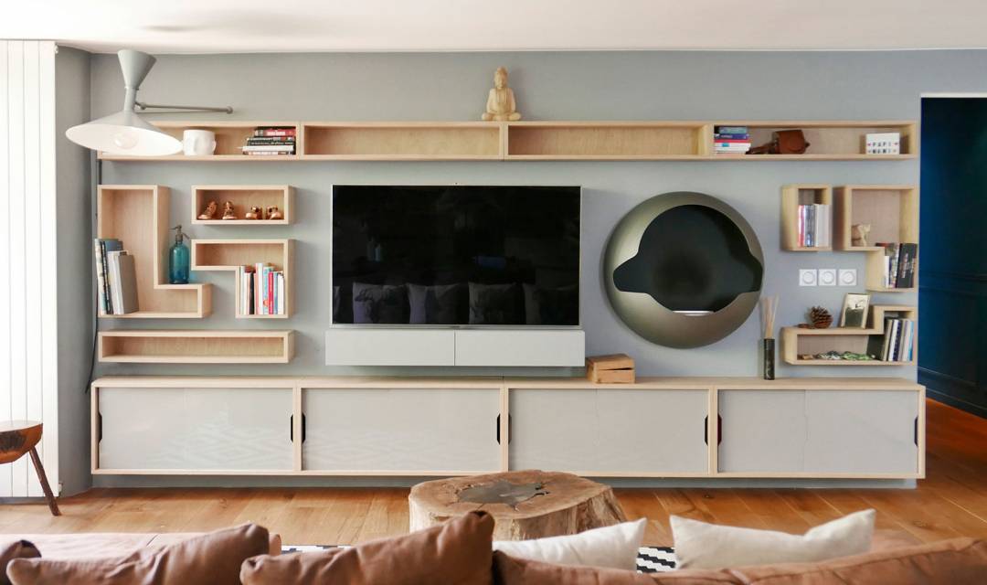 L'ensemble a été réalisé en chêne et les portes coulissantes des éléments bas sont en acier laqué. Des passages de cables amovibles sont aménagés en partie supérieure de ces caissons. L'ensemble des éléments électroniques relatifs à la télévision sont intégrés dans la partie du meuble la supportant; aucun cable n'est apparent.