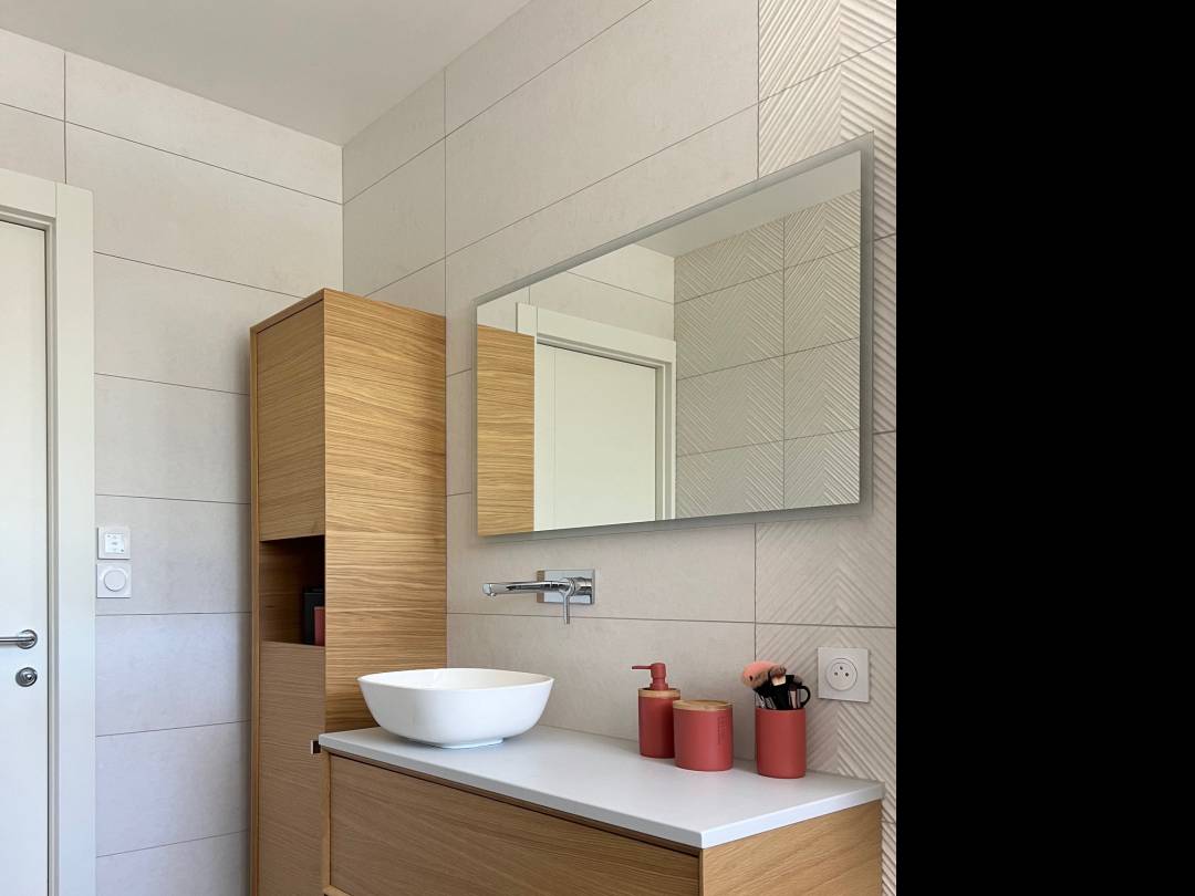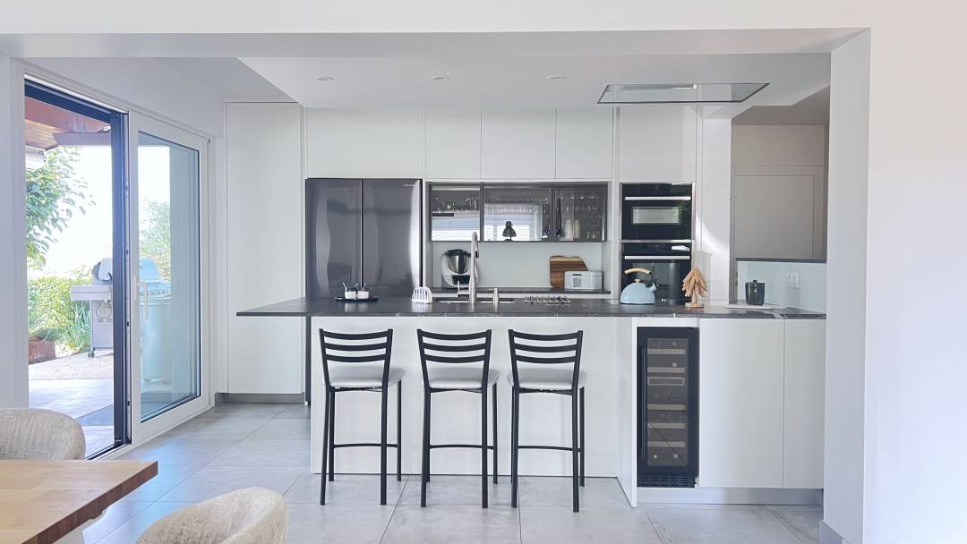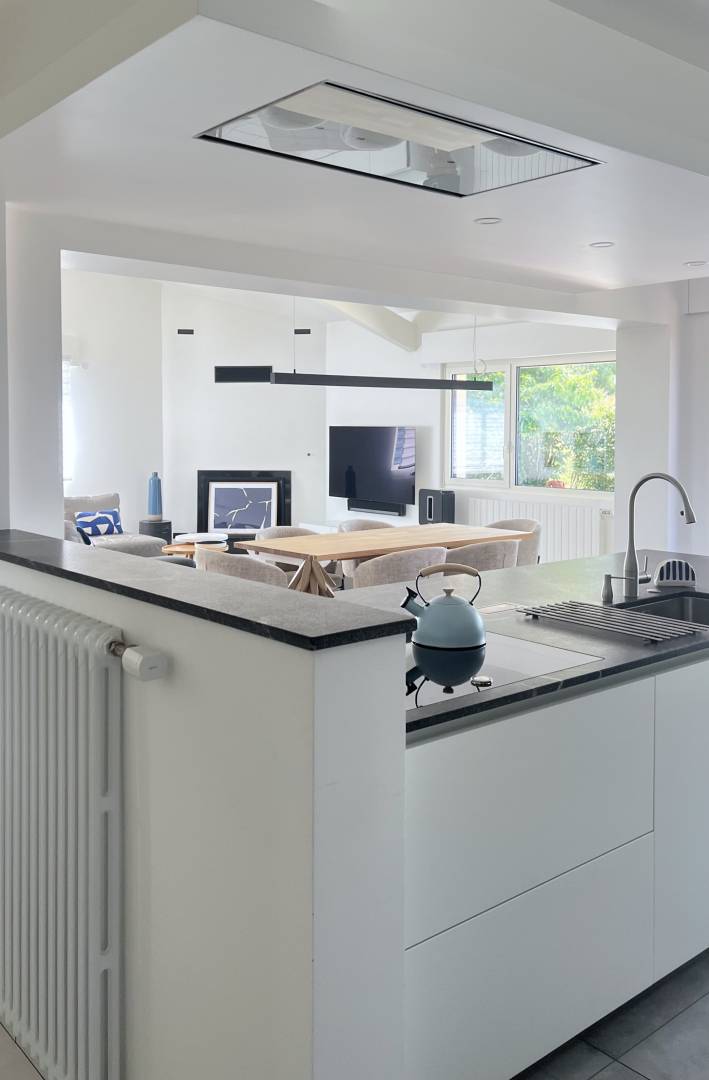 Le projet Les Bels consistait à repenser intégralement une maison construite dans les années 1970, en lui insufflant une nouvelle dynamique à la fois contemporaine, chaleureuse et cohérente avec son architecture d’origine. Cette rénovation a été menée comme mission complète, depuis l’analyse du potentiel jusqu’au suivi du chantier, en passant par la conception et les plans techniques. L’un des gestes fondateurs du projet a été l’ouverture d’un mur porteur entre la cuisine et le couloir. Cette intervention structurante a permis de décloisonner les espaces de vie et de créer une circulation plus fluide, plus intuitive, en lien avec les usages actuels. La lumière naturelle s’est imposée comme un axe fort, favorisée par des choix de matériaux clairs, des lignes épurées, et une distribution plus ouverte des pièces de jour. La cuisine, au cœur du projet, a été pensée comme un espace de vie convivial, fonctionnel et graphique, parfaitement connecté au séjour. Dans le salon, le mobilier bas, les tonalités apaisantes et les jeux de textures contribuent à une atmosphère douce et contemporaine. Les salles de bains ont été entièrement repensées dans une esthétique épurée, avec des équipements actuels et un soin particulier apporté au détail.