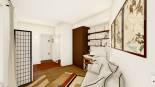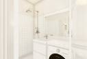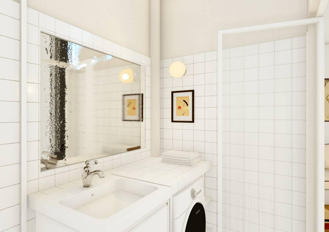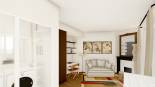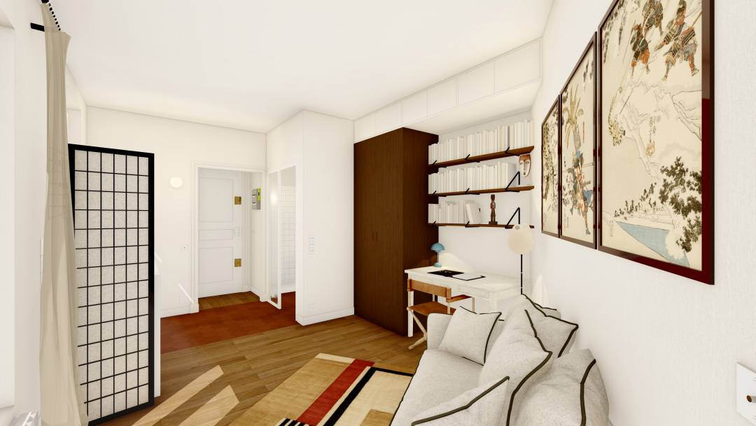 Pour ce premier achat, mes clients ont souhaité repartir sur de bonnes bases : l'appartement a donc été entièrement isolé pour améliorer ses performances énergétiques, conformément aux recommandations du DPE. Une fois l’enveloppe traitée, place au projet d’intérieur. L’intention : ramener de la lumière, optimiser chaque mètre carré et préserver le charme parisien existant. Les sols d’origine sont conservés et rénovés, pour faire dialoguer le bâti ancien avec un aménagement plus contemporain. La pièce phare du projet : une verrière sur-mesure, réalisée par un artisan parisien. Son verre flûté voile la salle d’eau tout en laissant la lumière du sud baigner cet espace immaculé. Le salon a été pensé comme un espace réversible, capable de s’adapter : recevoir, travailler, dîner ou dormir. Un paravent permet de masquer la cuisine lorsque celle-ci n’est pas utilisée. Résultat : une vraie sensation d’espace dès l’entrée, des circulations fluides et peu de cloisonnement visuel. Des usages clairement définis sans jamais alourdir la pièce de vie.