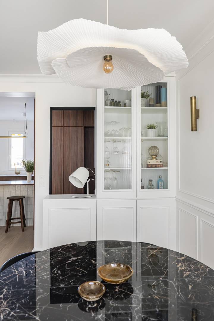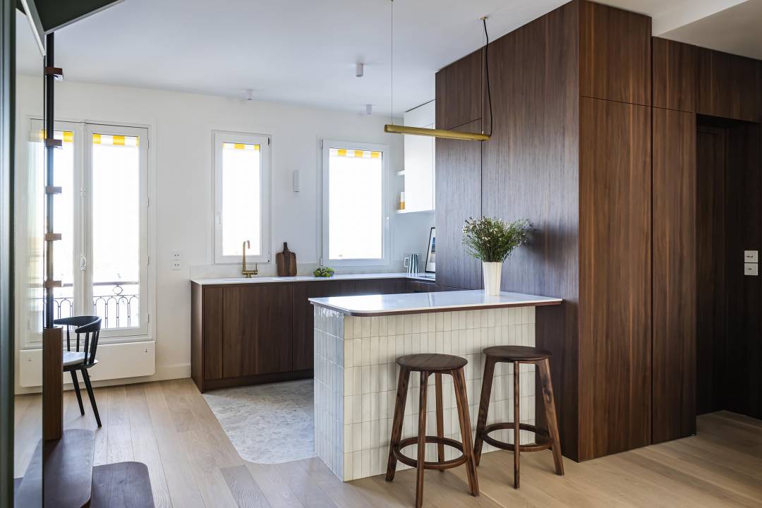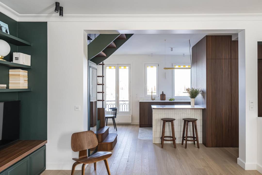 En plein cœur de Montmartre, ce duplex laissé dans son jus pendant 30 ans a été transformé en un écrin chaleureux et fonctionnel. Entre modernité et classicisme, cet espace familial allie optimisation des volumes, choix de matériaux nobles (noyer, pierre, zelliges) et jeux de lumière grâce à des miroirs subtilement intégrés. La rénovation énergétique a également été au cœur du projet, permettant de passer d'une étiquette DPE G à une étiquette DPE C, grâce à l’isolation renforcée et des solutions durables. Repensé pour offrir confort et élégance, le premier niveau s’ouvre en un espace de réception lumineux, tandis que l’étage abrite trois chambres sous les toits. Sobriété, textures maîtrisées et teintes terreuses créent une harmonie unique, adaptée au quotidien d’une famille parisienne.