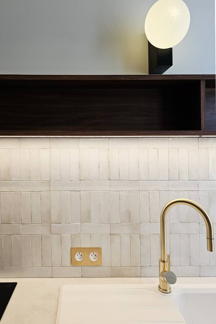 Dans cet appartement, l'accent a été mis sur la séquence d'entrée et cuisine, un grand meuble de rangement d'entrée se retour pour accueillir l'espace cuisine. Un mur porteur a été ouvert afin de créer un lieu de vie agréable et lumineux. La salle de bain a été repensé pour offrir un espace fonctionnel optimisé. L'ensemble propose une harmonie de teintes et matériaux intemporels et élégants.