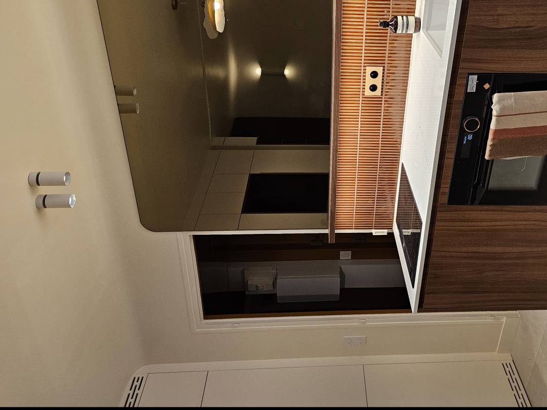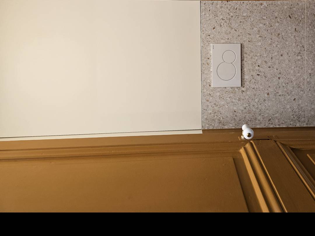 Situé dans le quartier Saint-Placide, ce pied-à-terre de 34 m² a été transformé pour accueillir une famille de quatre personnes. L’optimisation des espaces inclut une cuisine minimaliste près de l’entrée, un grand meuble de rangement sur mesure, et un coin bureau niché dans une alcôve. Le salon modulable devient un espace nuit d’appoint grâce à un rideau. Une palette chaleureuse de noyer, terrazzo, mosaïques, laiton et teintes terracotta / caramel est rehaussée par un sol effet béton ciré et des murs ivoires, apportant luminosité et élégance à cet appartement.
