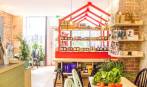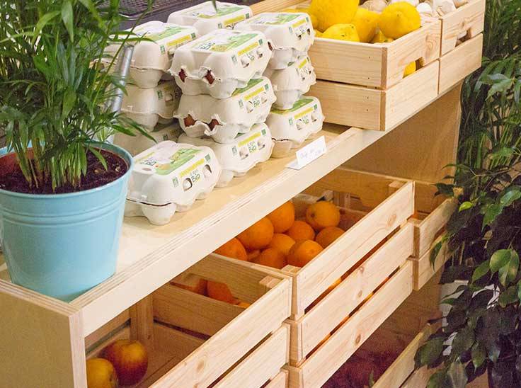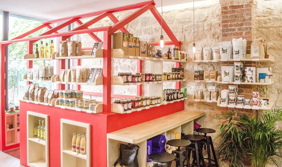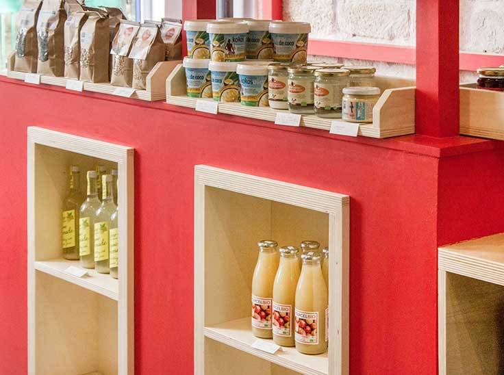 Pour la Cantine Oummi, nous avons dessiné des éléments venant s'intégrer dans une tiny house déjà présente dans leur espace. L'objectif était de penser des rayonnages offrant un maximum d'espace de mise en rayon et de rangements tout en laissant passer la lumière et le regard.