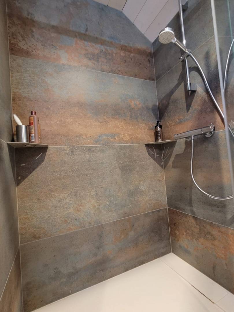 Salle d’eau master. Le mélange des matières, des styles avec un sol aspect bois et les murs en aspect oxyde. Jouer sur le naturel et le brut. #abk #carrelage #faience #architectedinterieur