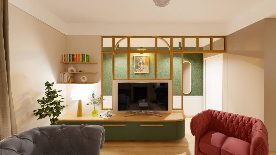 Un projet esprit Art deco ! 🎯 Objectif du client : • Supprimer la colonne • Repenser le mur de séparation entre l’entrée et le salon • Trouver une solution fonctionnelle pour les deux niches existantes 💡 Solution retenue : ✔️ Installation d’une verrière esprit Art Déco ✔️ Création d’un meuble TV sur mesure, parfaitement adapté à l’espace ✔️ Intégration de rangements optimisés à la place des niches