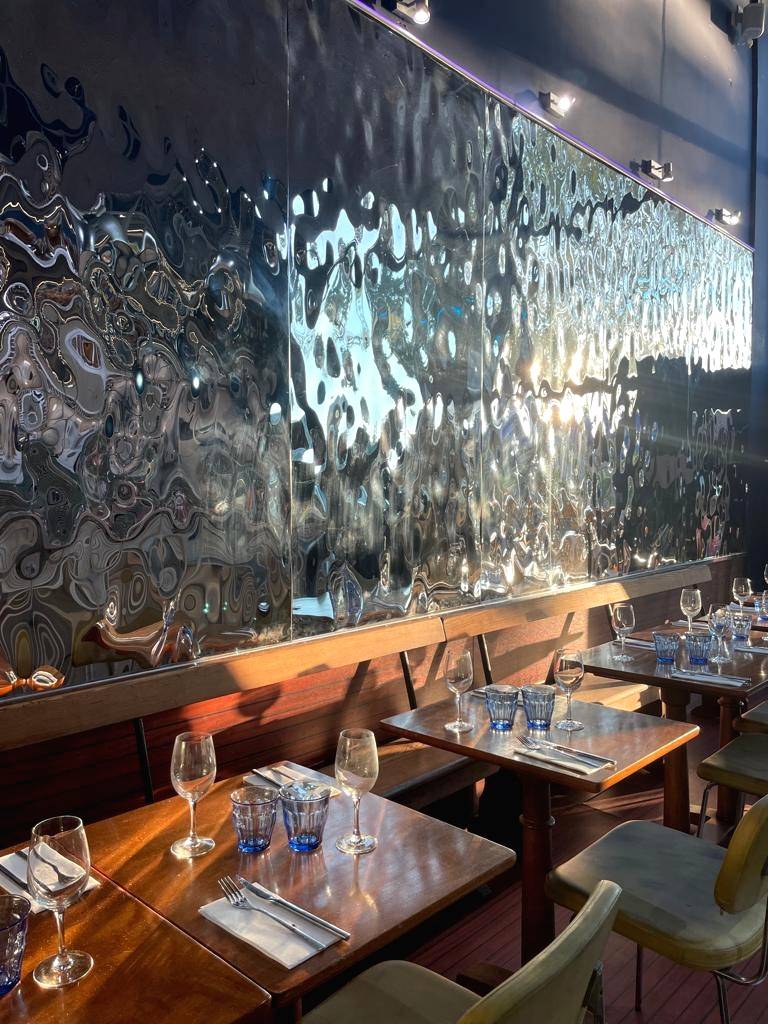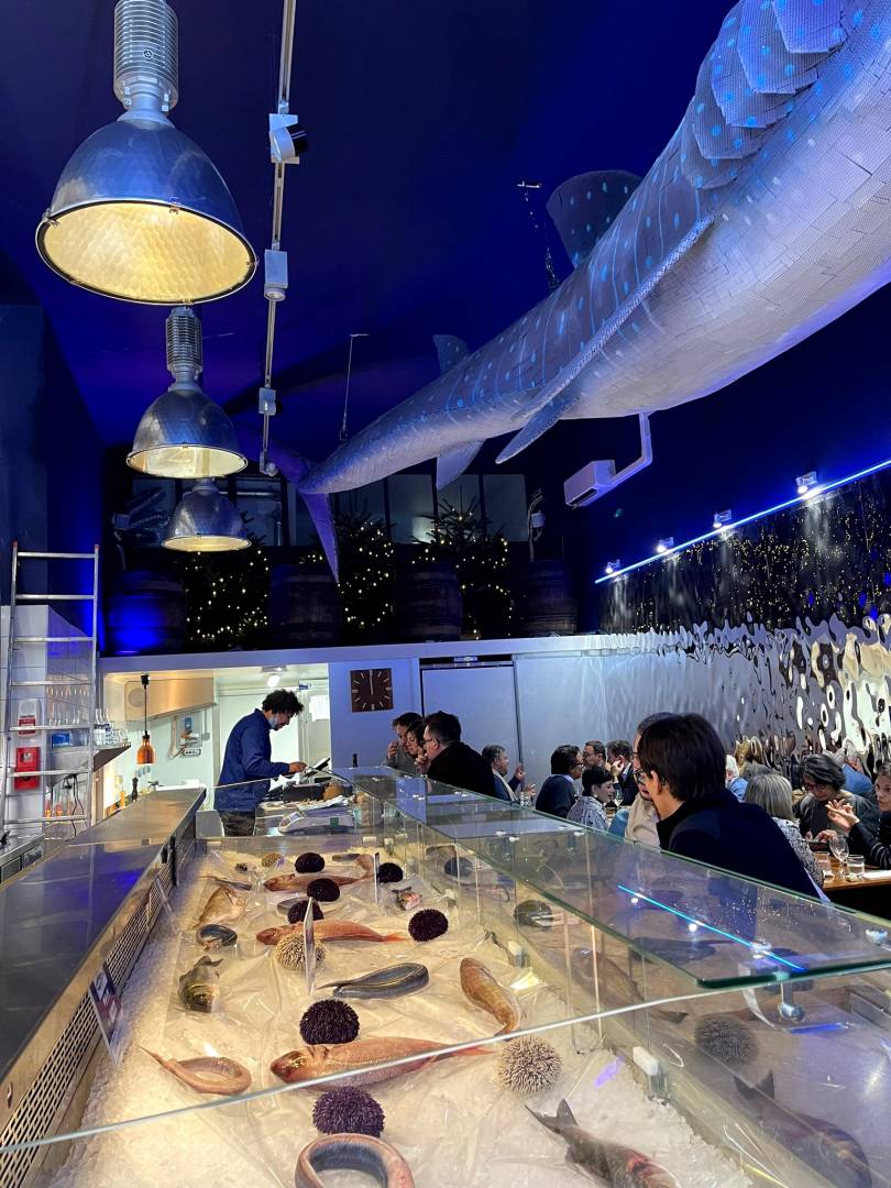 Dans ce volume longitudinal, la poissonnerie et le restaurant cohabitent en un parcours fluide, guidé par l’étal de glace et le bar central. L’acier inox, les reflets mouvants et la lumière bleutée composent une atmosphère immersive, comme une plongée sous-marine.