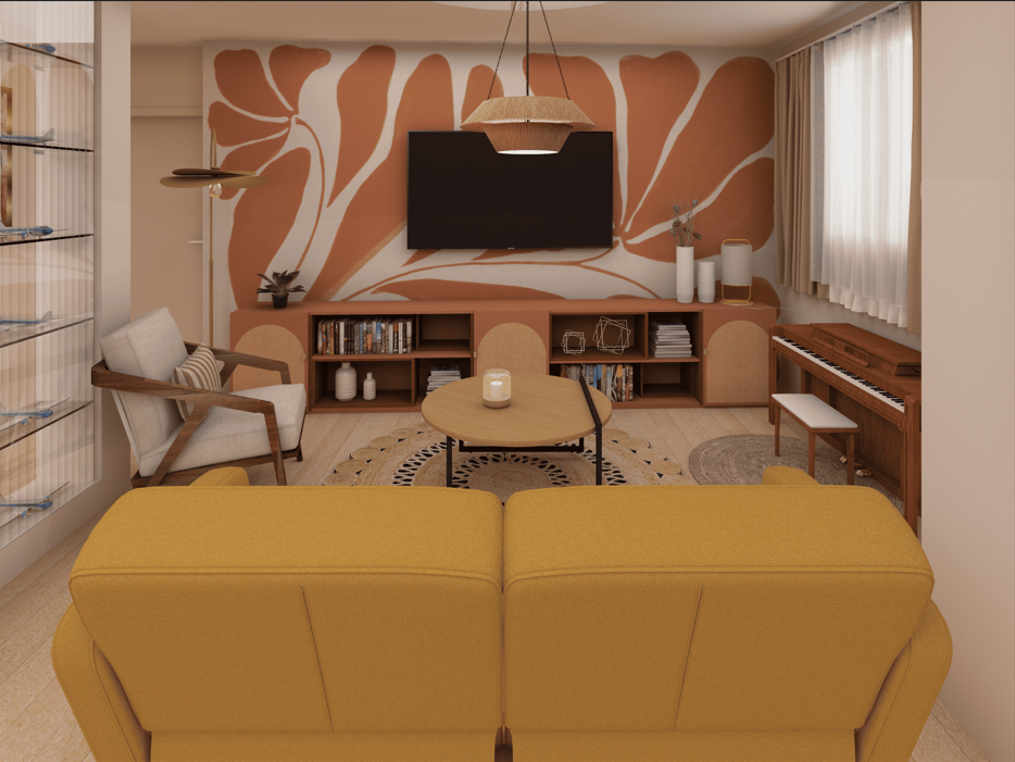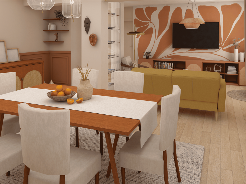 Pour ce projet, l’objectif était d’aider ma cliente à poser ses idées d’aménagement sur un plan 2D et à se projeter grâce à des visuels 3D, même si les travaux ne seront réalisés que bien plus tard. Nous sommes donc partis de ses envies, de son mode de vie et des contraintes existantes pour imaginer des ajustements simples, cohérents et optimisés.   ✨ Dans l’entrée, la circulation a été clarifiée : le passage vers la cuisine est repensé avec une verrière, permettant de garder le lien visuel et la lumière entre les deux pièces tout en apportant davantage de structure.   ✨ La cloison entre la cuisine et la pièce de vie accueille désormais une ouverture à mi-hauteur avec bar intégré, créant un accès direct et une transition plus fluide entre les espaces.   ✨ Côté salon, l’idée forte est d’ouvrir le volume en supprimant la cloison du couloir. Cela permet d’agrandir la pièce, de faire circuler la lumière et d’intégrer sur-mesure les poteaux porteurs, transformés en atouts plutôt qu’en contraintes. L’ensemble propose une vision harmonieuse, chaleureuse et évolutive du futur intérieur — un projet pensé pour accompagner les besoins de ma cliente, tout en restant réaliste et adaptable dans le temps.