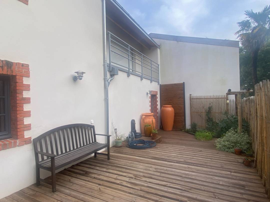 Dans la cour, une terrasse en bois a été réalisée pour rattraper le dénivelé existant et harmoniser cet espace petit et charmant.