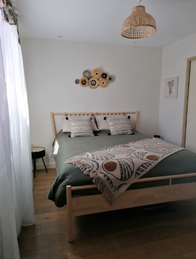 Coaching déco pour redonner un peu de vie à cette chambre parantale. Nous avons juste un peu accessoirisé, joué avec les matières et motifs car il fallait rester dans un budget serré.