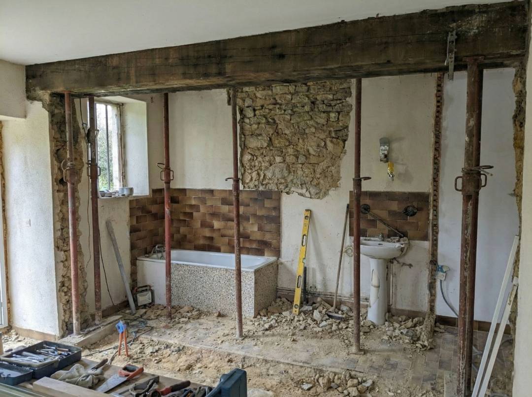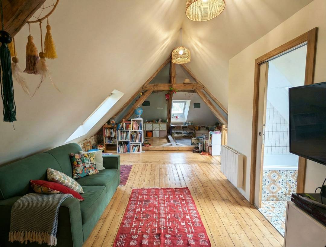 Notre mission a commencée par le curage de l'intérieur pour révéler la texture historique. Nous avons transformé l'ancienne cuisine en salon pour profiter des conduits de cheminée retrouvés. Nous avons créé une vaste cuisine conviviale dans l'ancienne salle de bain, désormais ouverte sur le jardin. L'ouverture de murs porteurs a fluidifié la circulation et fait entrer la lumière traversante. Les combles, aux vieilles poutres d'origine, sont devenus un étage habitable complet, incluant une nouvelle salle de bain.