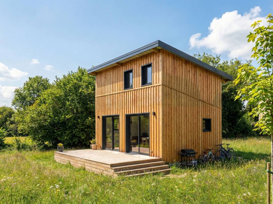 L'architecture bioclimatique. Nous avons fait le choix radical de l'immersion : aucune clôture. La maison est posée dans la prairie, les vaches paissent devant la façade. L'esthétique vise la simplicité : un volume compact de 30 m² au sol, une "cabane" qui cherche la discrétion. L'orientation plein sud et l'isolation totale en laine de bois rendent le chauffage quasi inutile (500W en appoint).