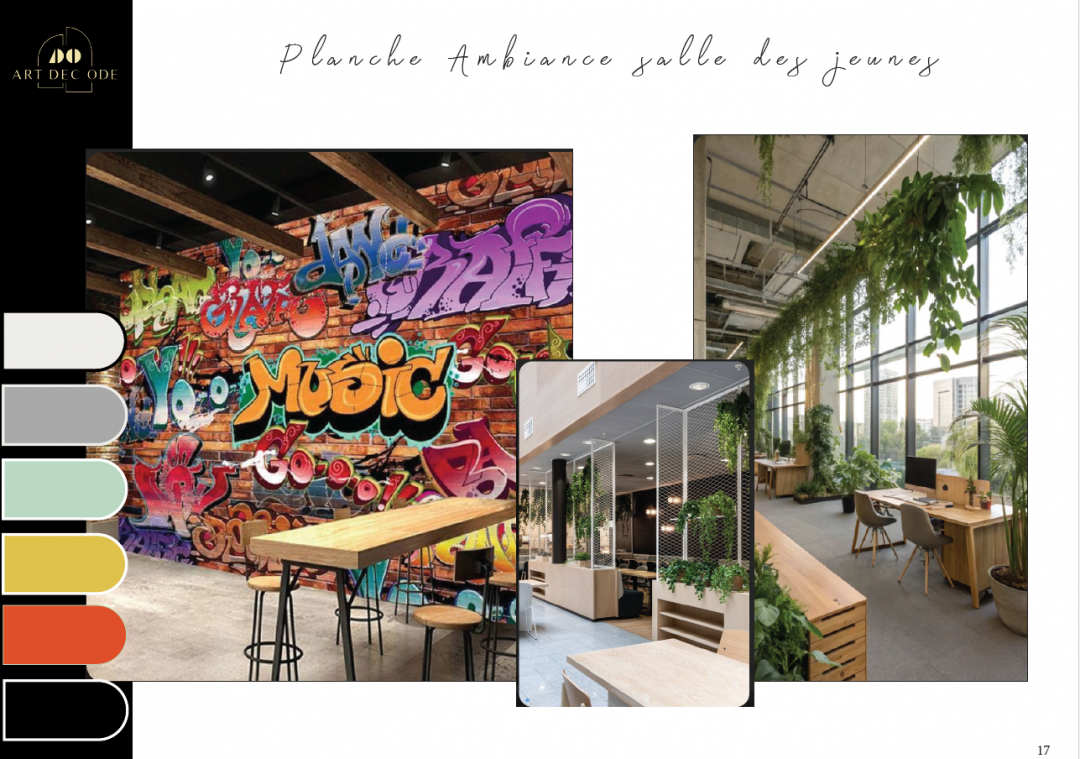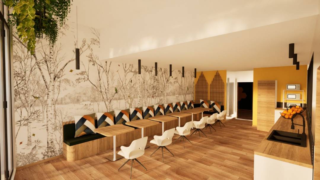 Rénovation d'un centre de formation, salle de détente des professeurs et de jeunes. Respecter la charte graphique du centre de formation. Style choisi " industriel ". Contraintes techniques, quelques murs porteurs, et murs de refends. Plafonds hauts, réduire au maximum la raisonnance des lieux. Créer un espace plus moderne, plus fonctionnel et plus lumineux.
