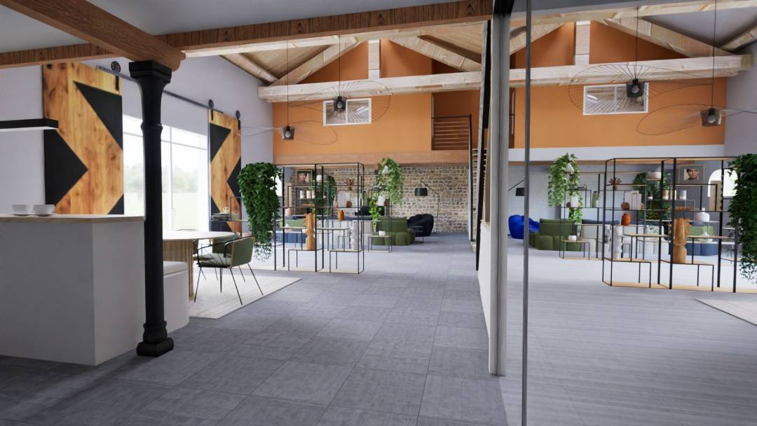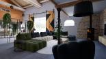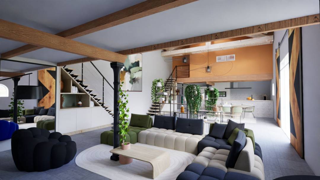 Décoration d'un loft vigneron. Contrainte piliers de soutien des mezzanines en position centrale difficile à aménager. Avantage du lieu trés beau plateau. Style choisi moderne.
