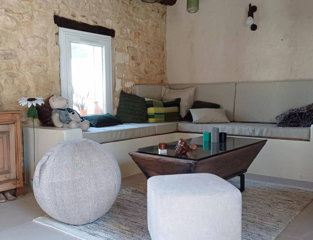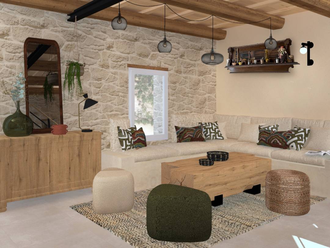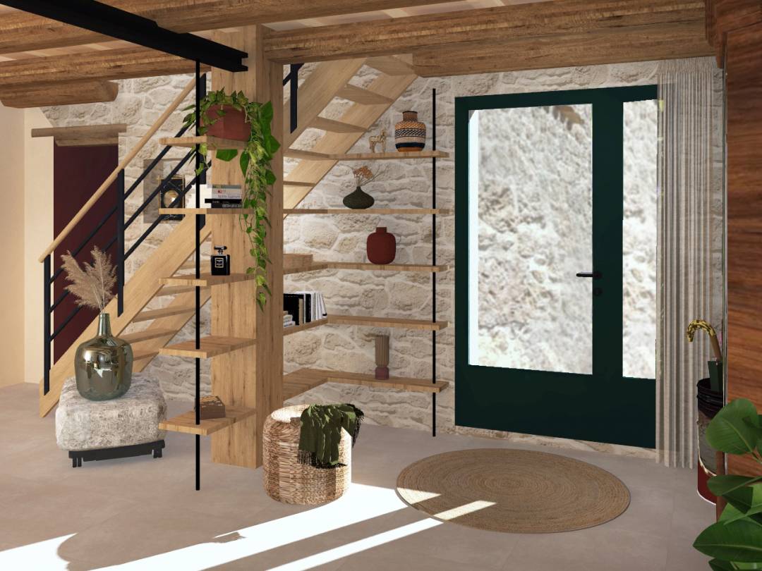 Transformer un hall d’entrée de 30 m² en un espace fonctionnel, lumineux et accueillant, tout en respectant l’âme d’une ancienne ferme. Sous l’escalier existant, des étagères sur mesure intégrées dessinent un claustra architectural. Elles redéfinissent les volumes et créent une véritable séquence d’entrée : vide-poches intégrés, assise, tapis encastré, vestiaire, espace dédié aux chaussures. Chaque élément a été pensé dans une logique d’usage, de fluidité et d’élégance. Sous la fenêtre, un banc intégré transforme la lumière naturelle en matière première. Un coin lecture ouvert sur l’extérieur, où le soleil traverse désormais la pièce. Dans une démarche sensible et responsable, la majorité des mobiliers d’héritage ont été conservés. Ponçage, retravail des finitions, repositionnement stratégique : chaque pièce retrouve sa noblesse et sa fonction. L’armoire miroir, replacée à l’entrée, devient à la fois pratique et scénographique: dernier regard avant de sortir. Le changement de revêtement de sol et la teinte du plancher bois en sous-face éclaircissent radicalement l’espace et apportent fraîcheur et cohérence. En contraste, le dégagement menant à la chambre et à la salle de bains s’habille d’un rouge pourpre profond, chic comme un rouge à lèvres. Une boîte colorée qui crée perspective, profondeur et identité forte.