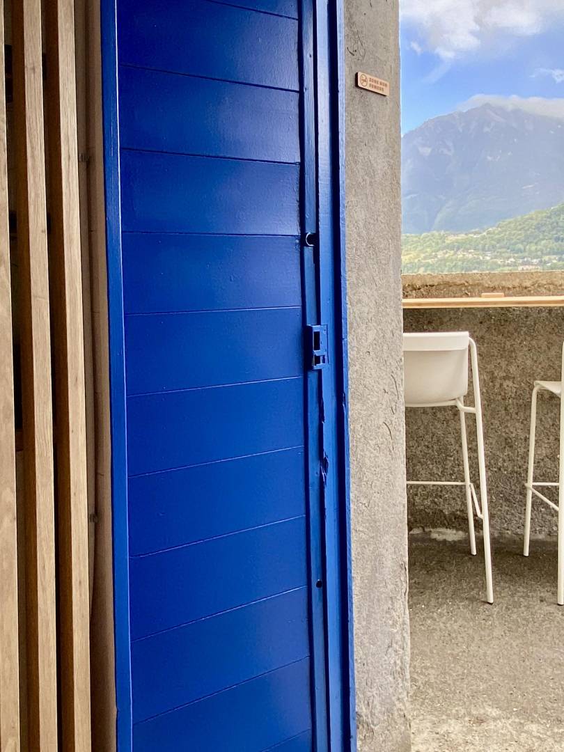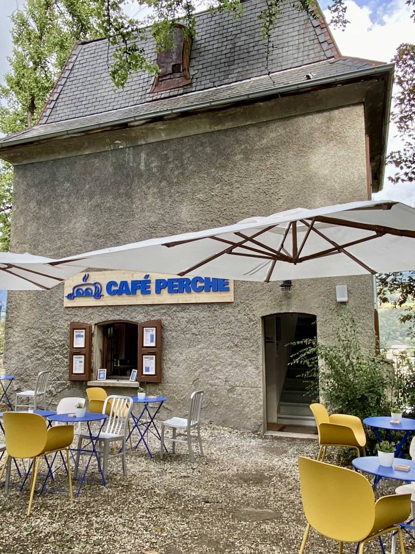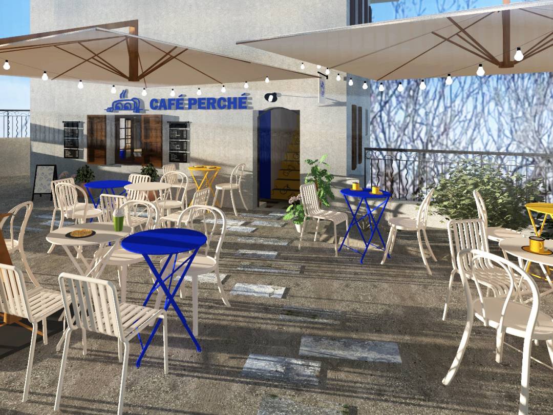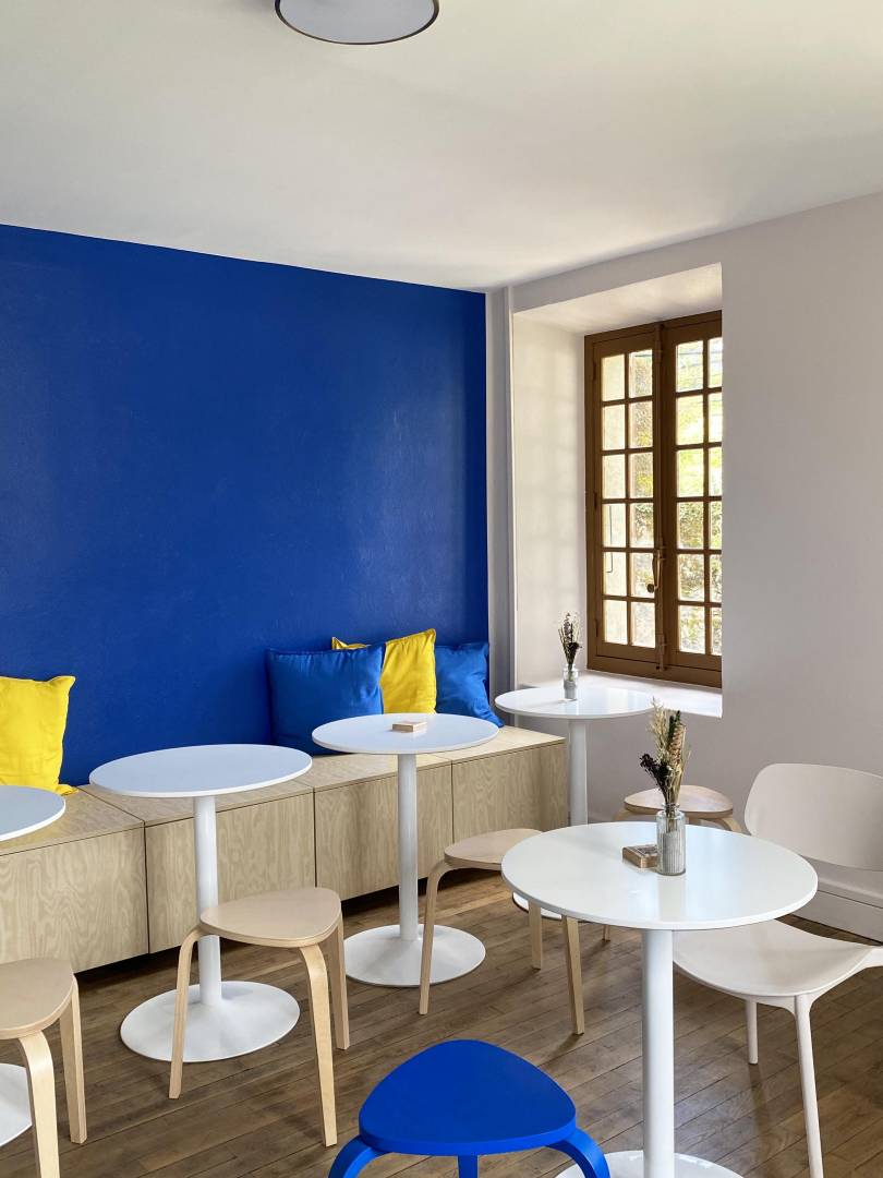 Situé dans la cité médiévale de Conflans, le projet du coffee shop Café Perché, s’inscrit dans une tension volontaire entre l’histoire médiévale et une identité dynamique inspirée par l’univers de la montagne et du sport . Le lieu se perçoit à la fois sur le plan culinaire, graphique et spatial , la couleur servant d ’outil pour activer l’existant et créer du contraste. Le bleu électrique se veut vibrant et audacieux, le jaune évoque la lumière du matin. Ces teintes affirment l ’ identité contemporaine du lieu. Elles constituent la ligne directrice du projet, mettant en valeur les cheminements et les vues vers l'extérieur. Saveur et couleur participent à une immersion chromatique, pensée comme une expérience sensorielle.