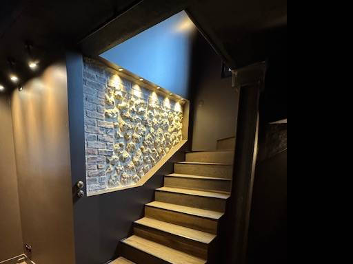 Rénovation totale du sous sol dans une maison en bord de mer. Cuvelage sur toute la surface, jusqu' à 1m30 sur les murs, décaissement, étude béton pour ouvrir 2 murs porteurs, changement de l'escalier et des menuiseries extérieures. Calepinage pour les carreaux de ciment entourés par le parquet massif huilé Redistribution des espaces. Création d'un espace technique avec chaudière, buanderie discrètement dissimulées derrière d'anciennes portes de placard chinées. Installation d'un poêle "Petit Godin" à bois, sur un ancien conduit de cheminée que nous avons changé intégralement, et de radiateurs en fonte chinés puis sablés.