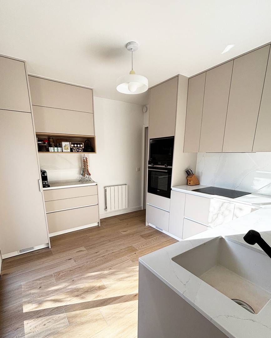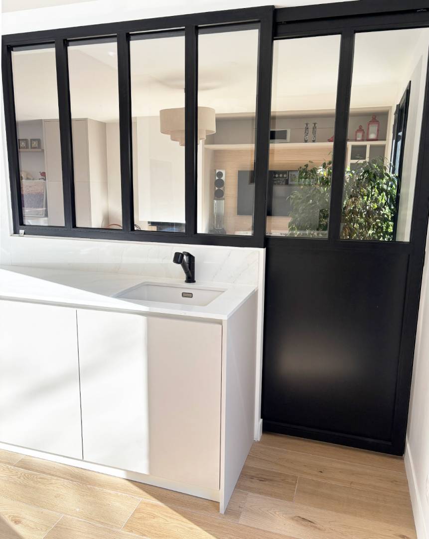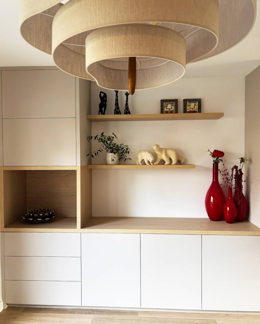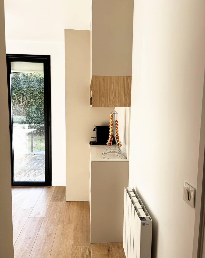 Rénovation complète du rez-de-chaussée d'une maison familiale. Conception des meubles sur-mesure, accompagnement dans le choix des matériaux, revêtements et mobiliers.