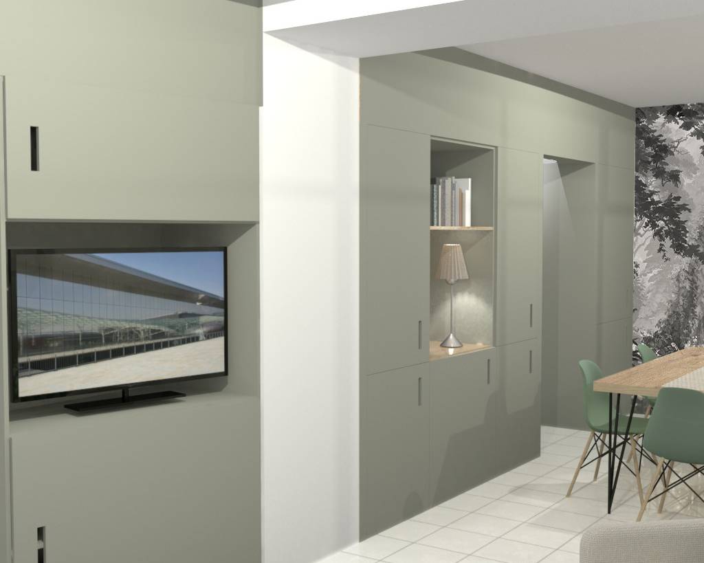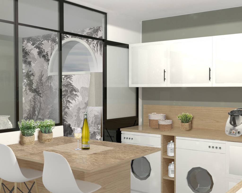 Un projet qui avait pour but de modifier l’implantation de la partie séjour et salle à manger mais également de redéfinir les accès à ces espaces depuis la cuisine. L’emplacement de la cuisine et l’espace repas quotidien ont été conservés. Quand à la partie séjour et salle à manger, ces dernières ont été inversées. L’idée du projet: conserver au maximum le mobilier existant pour chaque pièce et les restaurer pour les remettre au goût du jour, afin de limiter le budget. Remplacement de la cloison entre la cuisine et la nouvelle salle à manger, en verrière type atelier avec ouverture, pour plus de lumière et d'accessibilité. La porte existante entre l’espace repas et le nouveau séjour est condamnée afin de gagner de l’espace. Création de rangements tout hauteur et en enfilade sur un pan de mur permettant l’optimisation des rangements et dissimuler l’accès à la suite parentale. Conservation des meubles existants de cuisine et ajout de deux colonnes pour réfrigérateur et micro-onde. Cuisine légèrement agrandie avec la nouvelle cloison/verrière et suppression du cellier afin de permettre d’accueillir un îlot. Mes clients souhaitaient conserver au maximum leur mobilier et les restaurer si nécessaire. La volonté également de rendre les espaces plus lumineux et modernes avec du blanc agrémenté d'une couleur pastel.