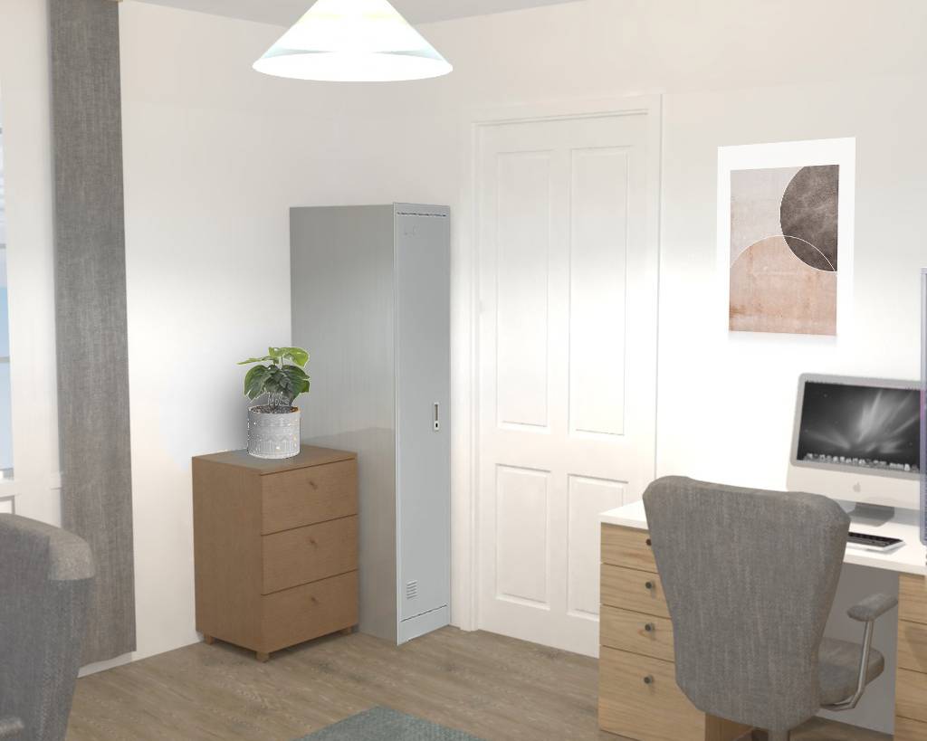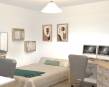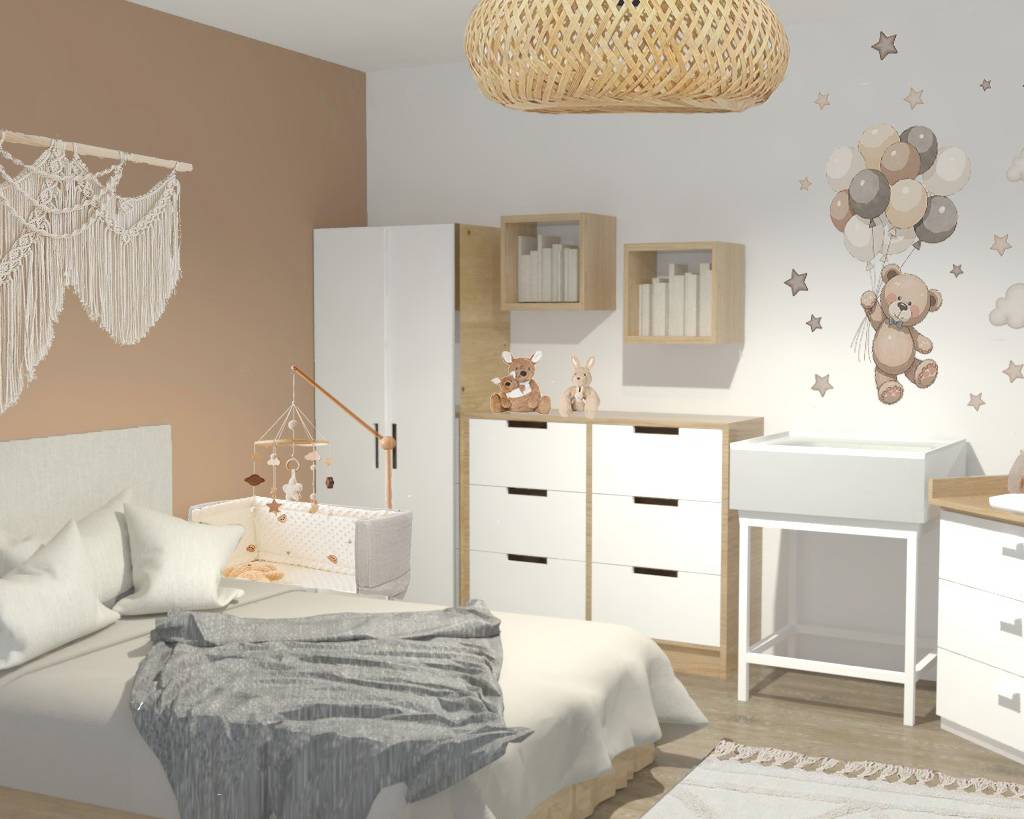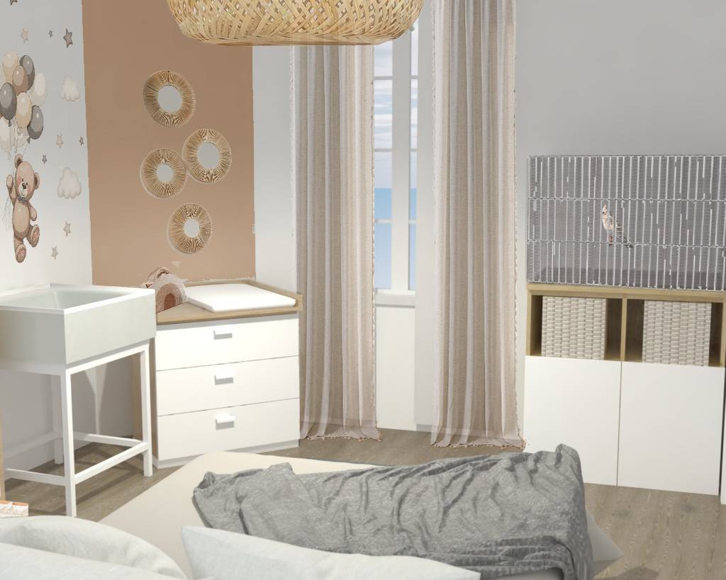 Le projet consiste à réadapter une chambre parentale pour l’arrivée d’un nouveau né. Il fallait pouvoir y installer un Cododo, un kit baignoire et évidemment une table à langer. Les clients souhaitaient une ambiance cocooning, chaude et apaisante pour la venue du bébé. L’espace doit être fonctionnel, aéré et pratique. La surface de la chambre faisant tout de même 13m², cela nous permet d’amener le mobilier nécessaire pour le bébé, mais aussi de créer du rangement (penderie, commode). A la demande du client, nous avons pu conserver la cage à oiseau. Le mobilier en bois clair et blanc permet d’adoucir, à la différence de la tête de lit dans les tons Terracotta qui réchauffe la pièce. Les éléments textiles comme les tapis et les rideaux permettent d’appuyer l’idée de chaleur et de cocooning.